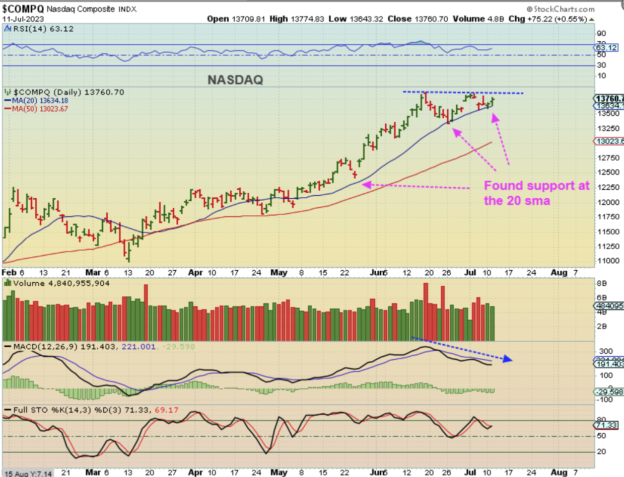 THE NASDAQ dropped and reversed at the 20 sma again. I’ve been looking for a pullback, since we had divergence at the highs, but so far the 20 sma is holding up price. That divergence can also just re-set with choppy sideways price action if this remains bullish and buyers continue to prop it up.