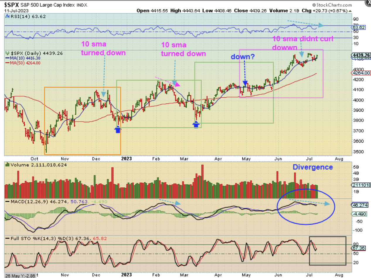 THE SPX – When we look for a dcl, we look to see if the 10sma turned lower and here I am showing you how that did happen before the 1st dcl, 2nd dcl, and 3rd dcl, but the 10sma didn’t curl down on that last dip. So was that a dcl, or is one still ahead with this divergence at the double top? That is a tough call. These markets are resilient, and I have said that what you would do is buy that last dip ( or add to current position) and raise stops along the way to be able to stay in the trade. So far the markets are still chopping higher.vI am mentioning this because…