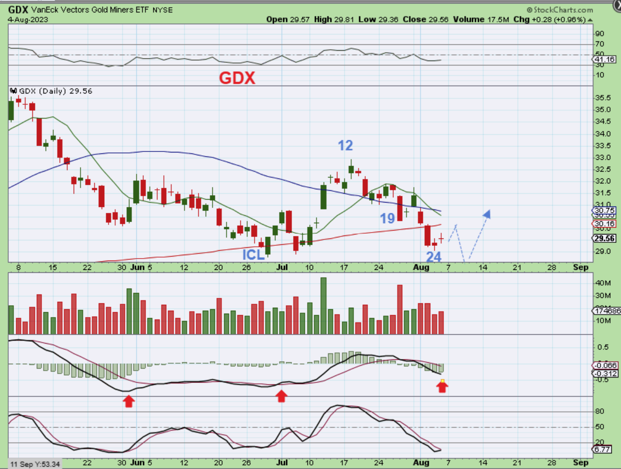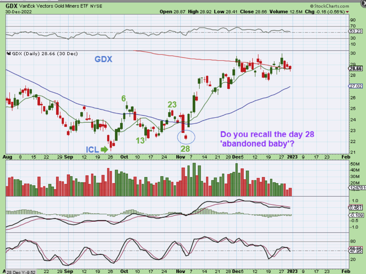 Do you remember when this was the September 2022 ICL and after that low was in place, The GDX chopped higher and lower and frustrated everyone, especially when it then gapped down on day 28? Well, if you recall this time period, you also will remember that this was the end of the selling.  I kept mentioning the ‘abandoned baby’ day after day, so I feel that you likely remember that now. Well, my point here & now is simply that we had a day 28 dcl.  It CAN happen in Bull Markets.