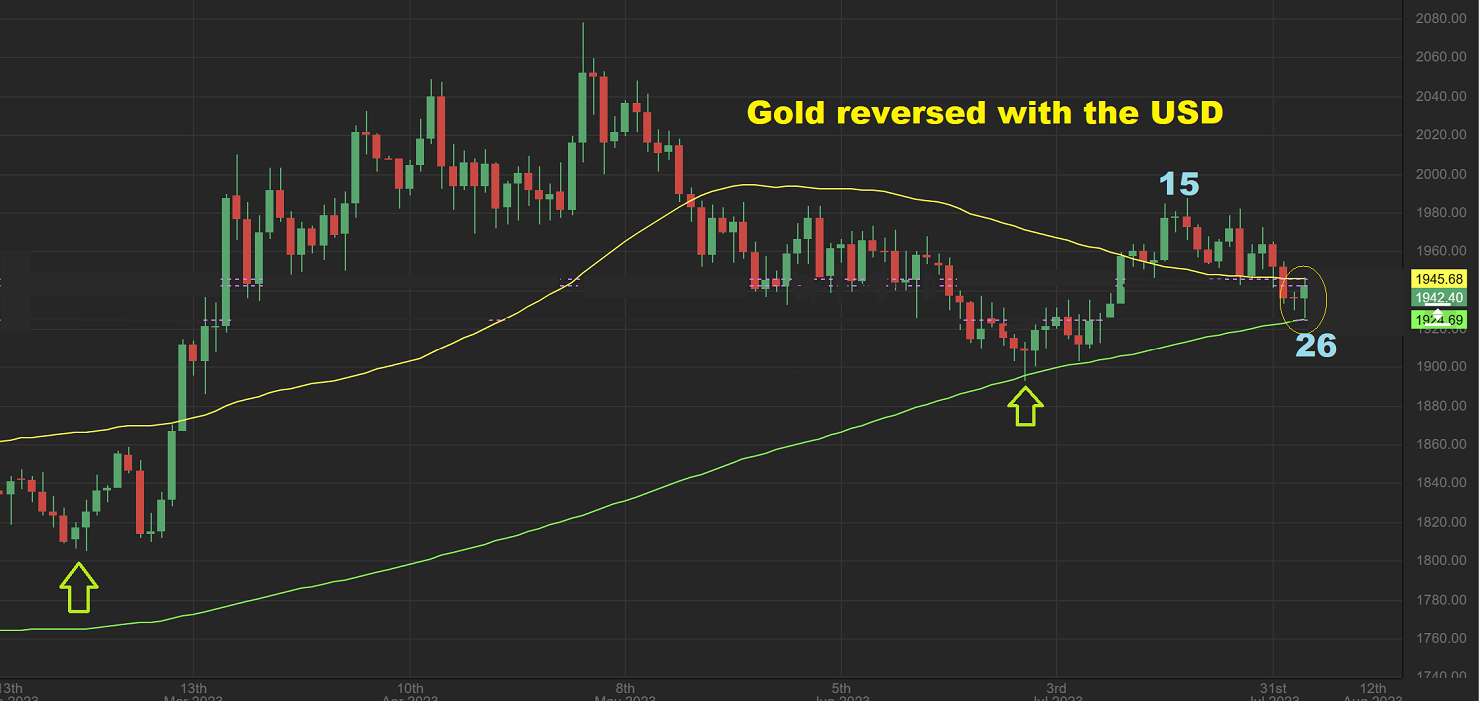 The SILVER Daily chart shows us that Silver also reversed when the USD was rejected on Friday. So at day 29 Silver reversed just above the 200sma. Silvers next move may depend on what the USD does next week. This could just bounce around here between the 50 & 200sma as it forms a dcl next week.