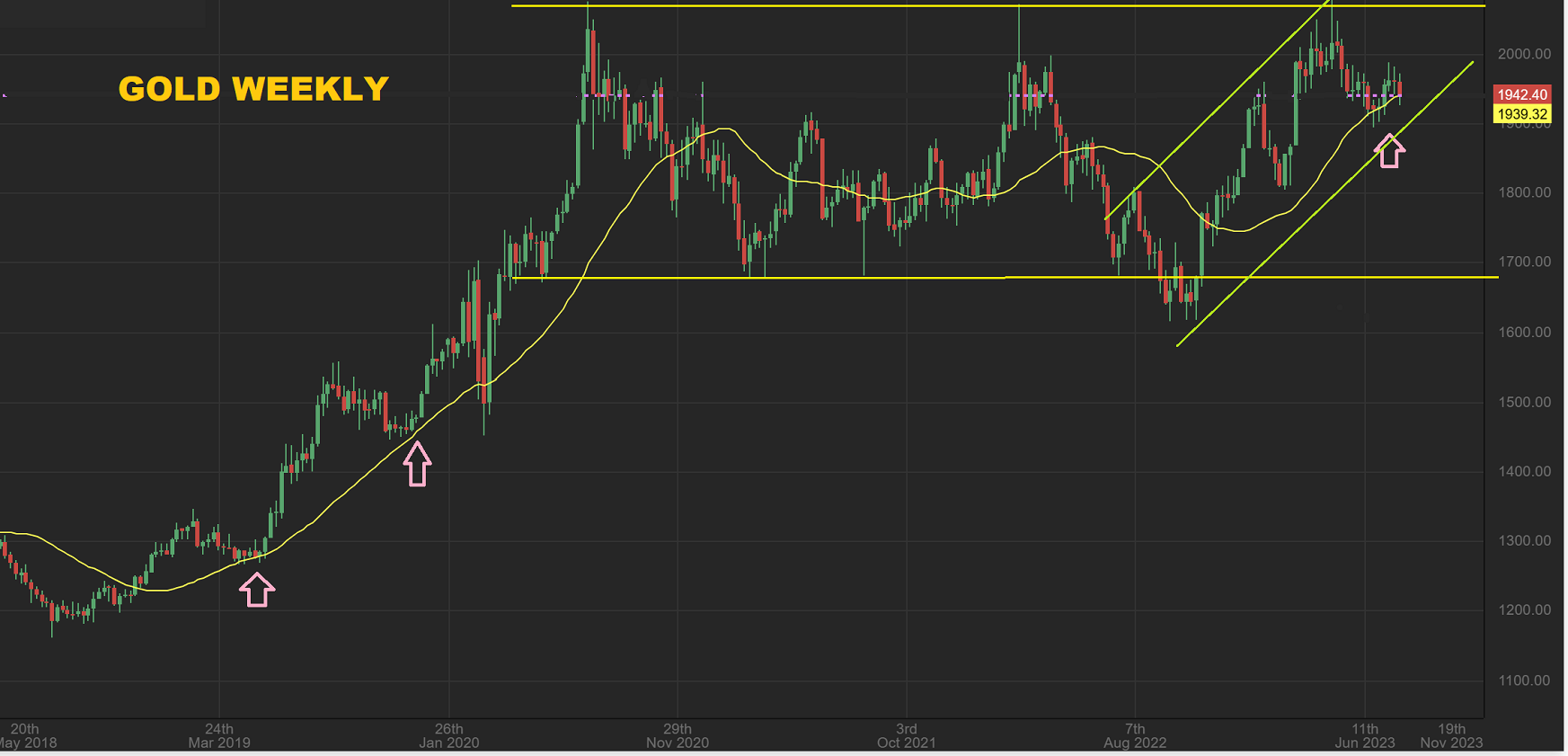 GOLD WEEKLY – The Big Picture is bullish as Gold pulls back and away from the all time highs. Price often does this to build energy for a break out.