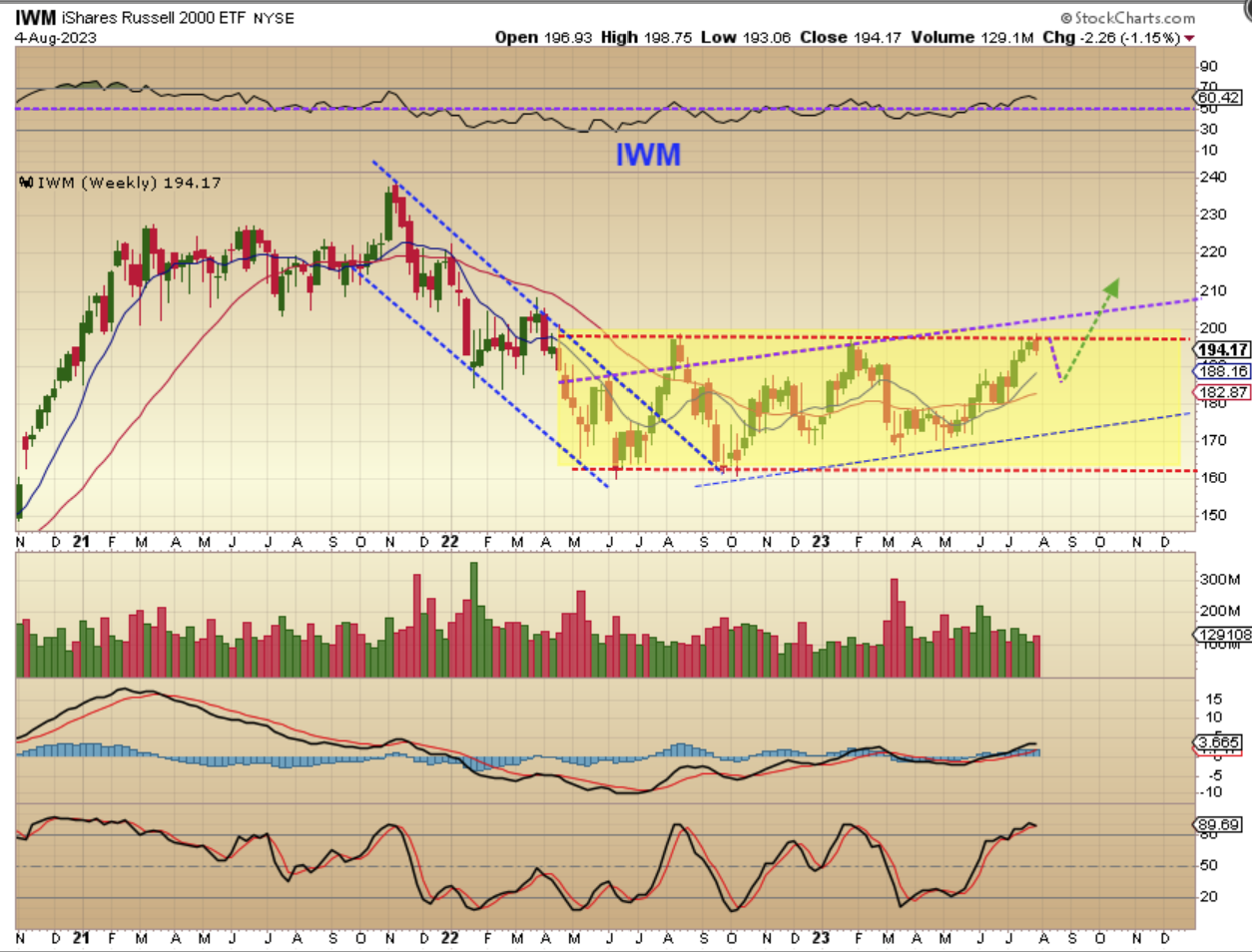 IWM WEEKLY – The IWM reached the top of a base pattern and stalled at resistance.  This also could pull back, but we really have seen some nice moves by EV Companies out of their bases lately, so I am only drawing a dip to the 10 & 30 weekly ma. I’ll be watching things closely in this sector if price drops to that area.