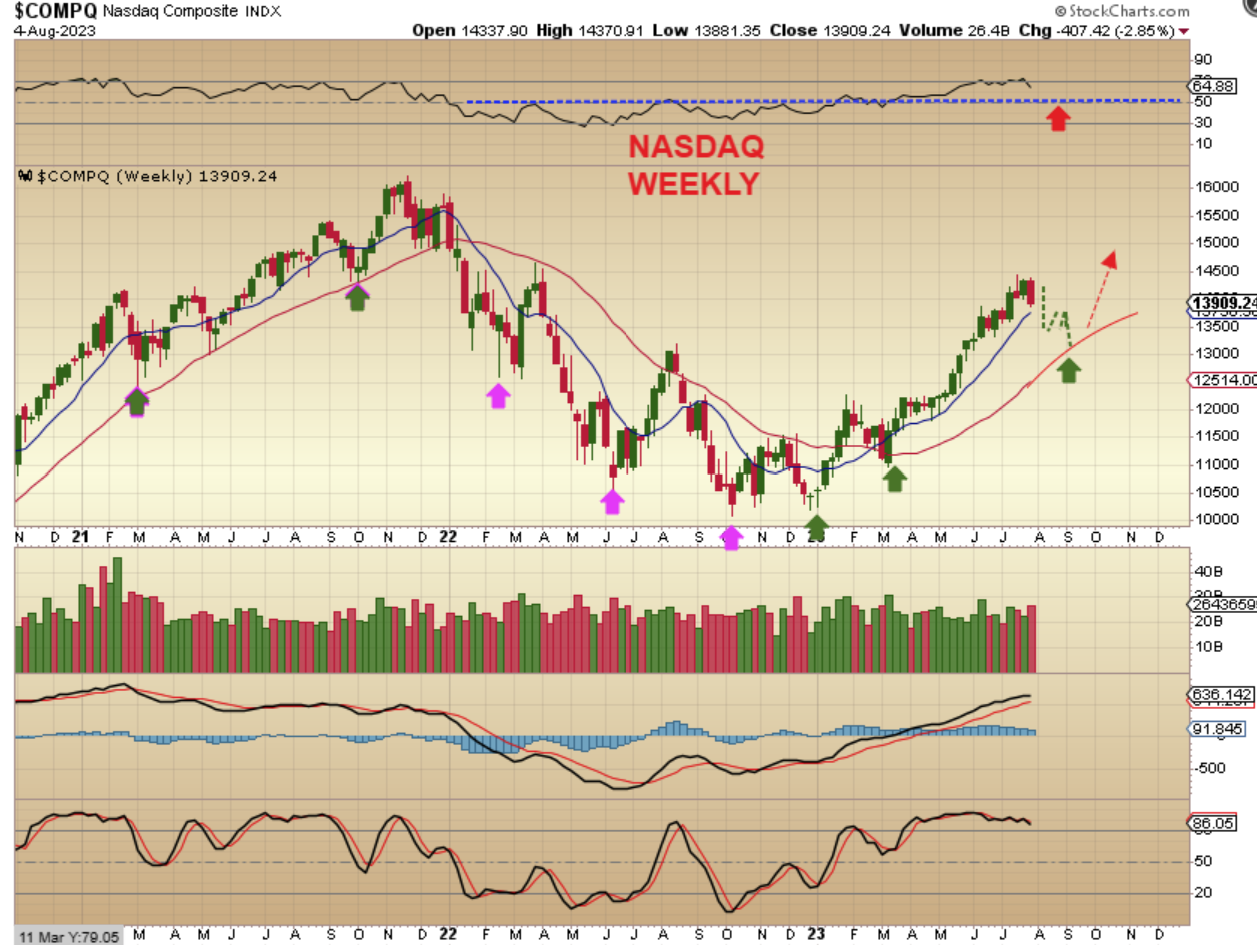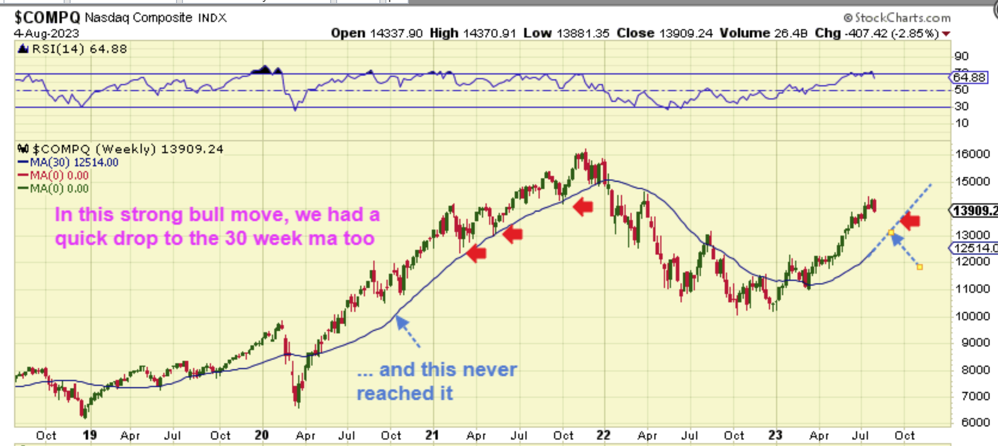 NASDAQ WEEKLY – Using a 30 week ma, the Nasdaq used to dip down an tag that, so I drew that here as an example of what we should expect, however…