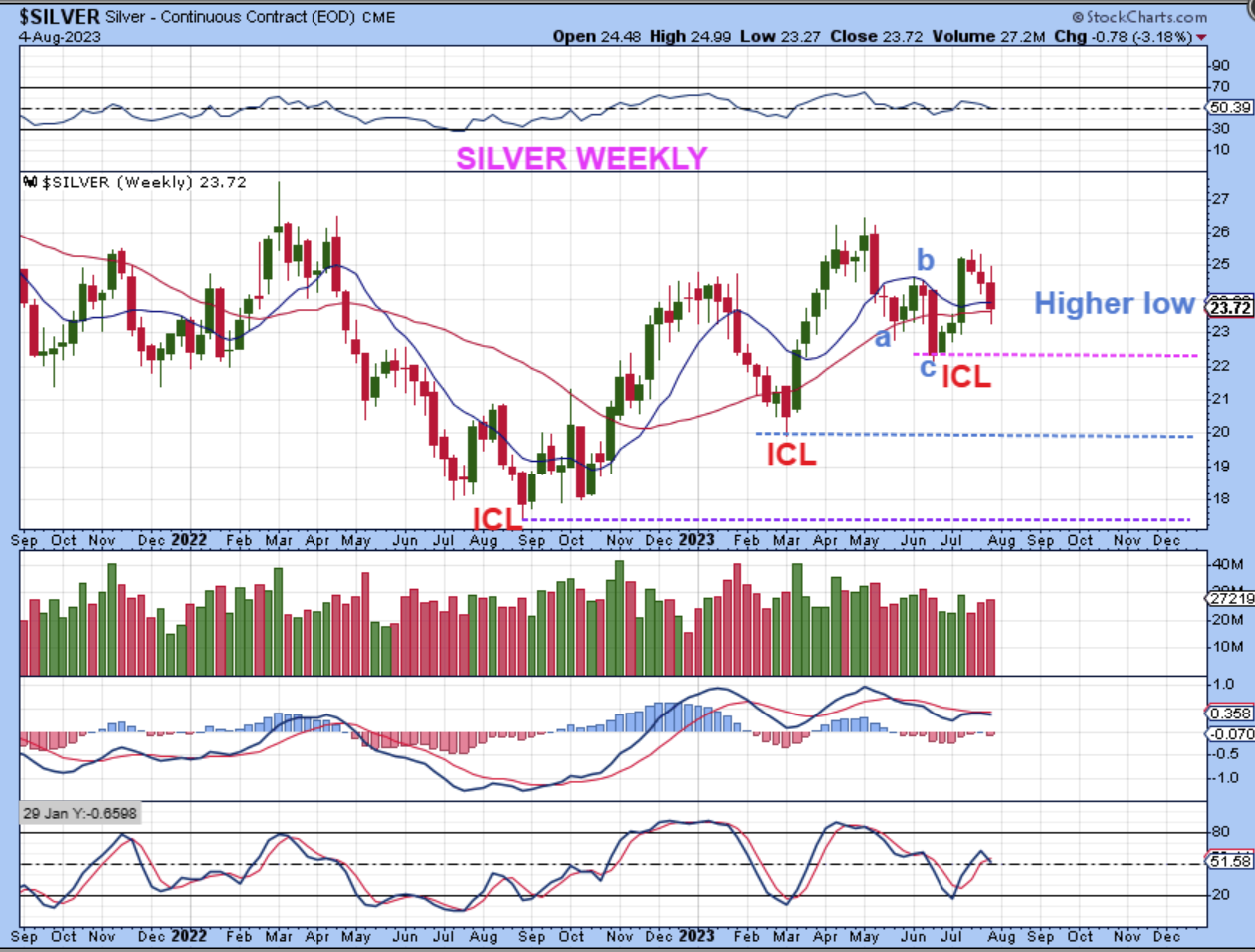 SILVER WEEKLY – Silver is still well above the ICL and a dcl could form at any time.