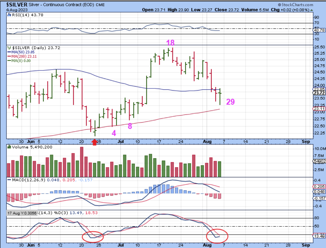 Gold, Silver, and the Miners have been dipping down toward a dcl, and we are in the mid 20’s for daily cycle counts. In a bull market run, you can get shorter daily cycles as the Bulls start jumping in early, so I reminded everyone about our day 28 abandoned baby last year. That became a dcl. We are watching for a swing low to develop to give us a dcl. We expect that dcl to come in around 32 days, but it can form early or a little late too.