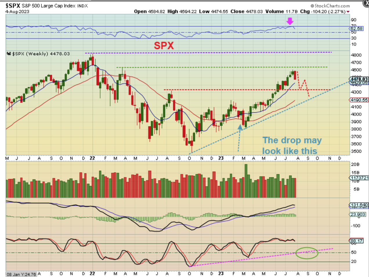 SPX WEEKLY – The General Markets were down this week, and I have been expecting a drop into a dcl and possibly even an ICL due to Overly bullish sentiment, Cycle timing, and a few other factors. What I have drawn here is the idea of a drop into a dcl, a new daily cycle (bounce) that rolls over as left translated into a new low ( ICL September?) at that trendline. Similar to the drop Jan to March.