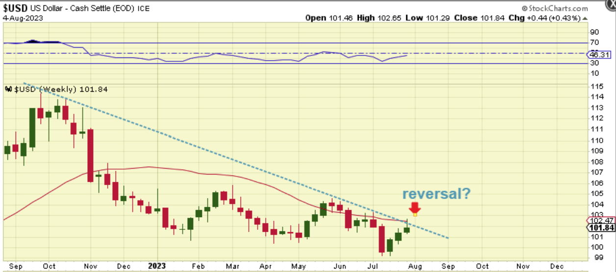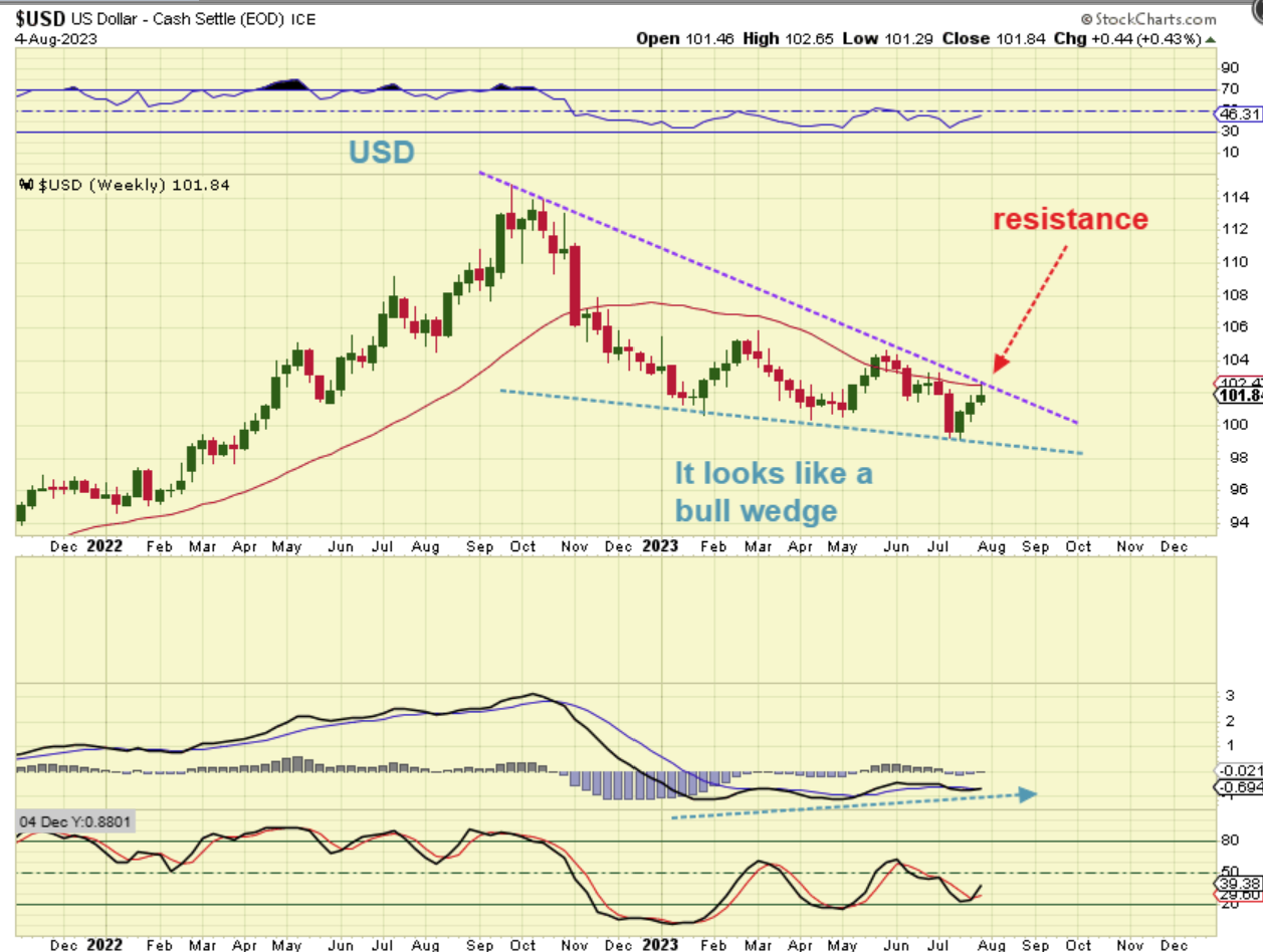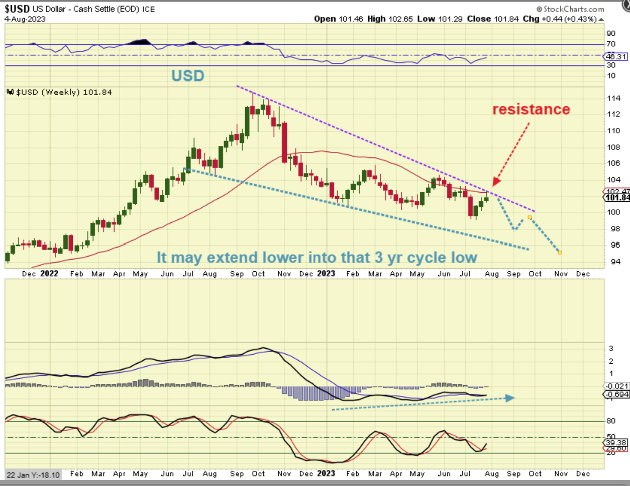 …but a continuation of the drop can just extend that wedge like this, and allow for the 3 yr cycle low to still come in at the beginning of 2024 and allow Gold to break out to new all-time highs. This chart would have the USD at the next resistance area and peak.