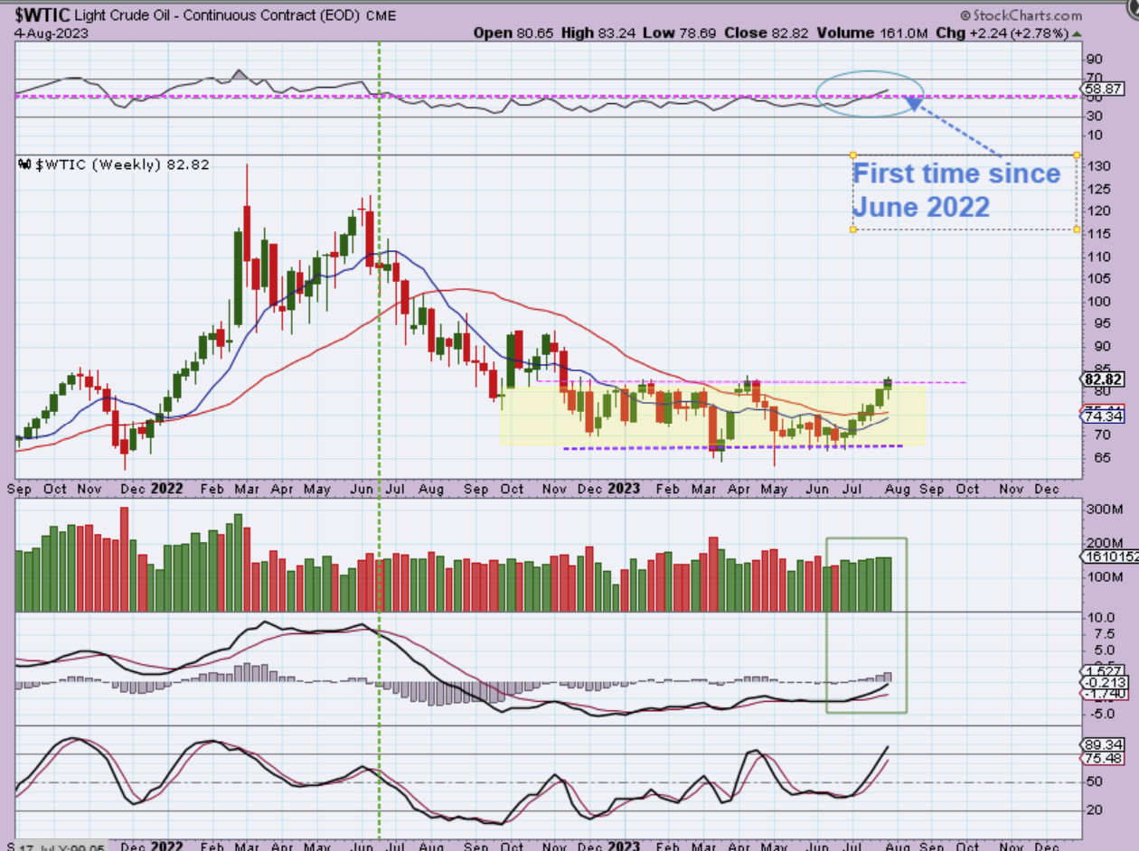 WTIC WEEKLY – Oil has been running higher for 6 straight weeks and is up at resistance, but that may not hold it back. The weekly RSI is now above the 50% area for the first time in over a year. After a very long basing pattern, Oil has been bullish for weeks.