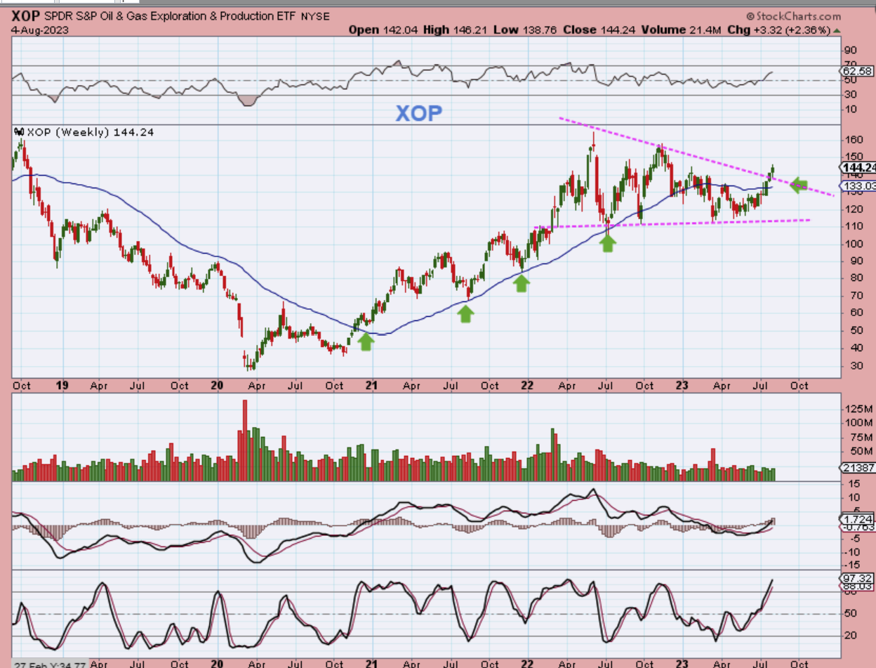 XOP WEEKLY – Oil stocks have been pointed out as bullish too, and when you step back you can see that the XOP has formed a massive sideways consolidation in the form of a triangle. It has broken out too, and regained the blue support line (50 week ma).