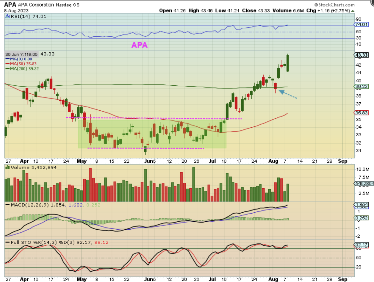APA was also in the reports back when this base shown started breaking out, and then it was discussed again near the 50sma as it puled back to break out.  The earnings at the 50sma caused a shake out and recovery, so now this has had a solid move higher too, and…