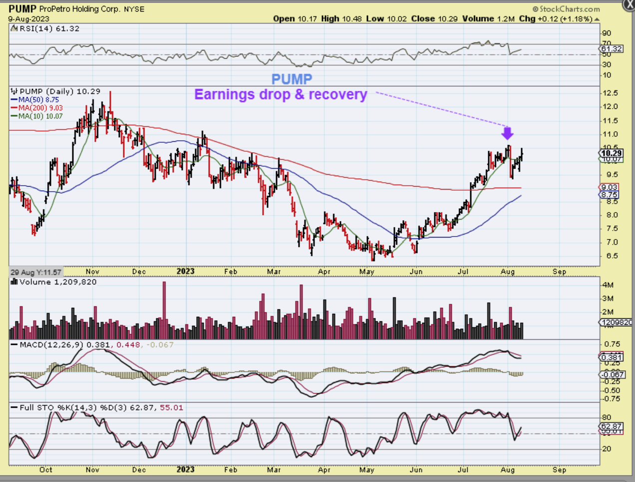 PUMP has had a nice run too, but recently it dropped sharply with their earnings report, but then started to recover. This is still a bullish set up with a speed bump from earnings.