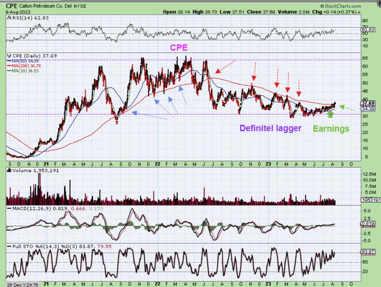 CPE is certainly a lagger, but they released earnings a few days ago and since they did I see volume increasing on the upside. This can be a buy and hold now for the long term trader.