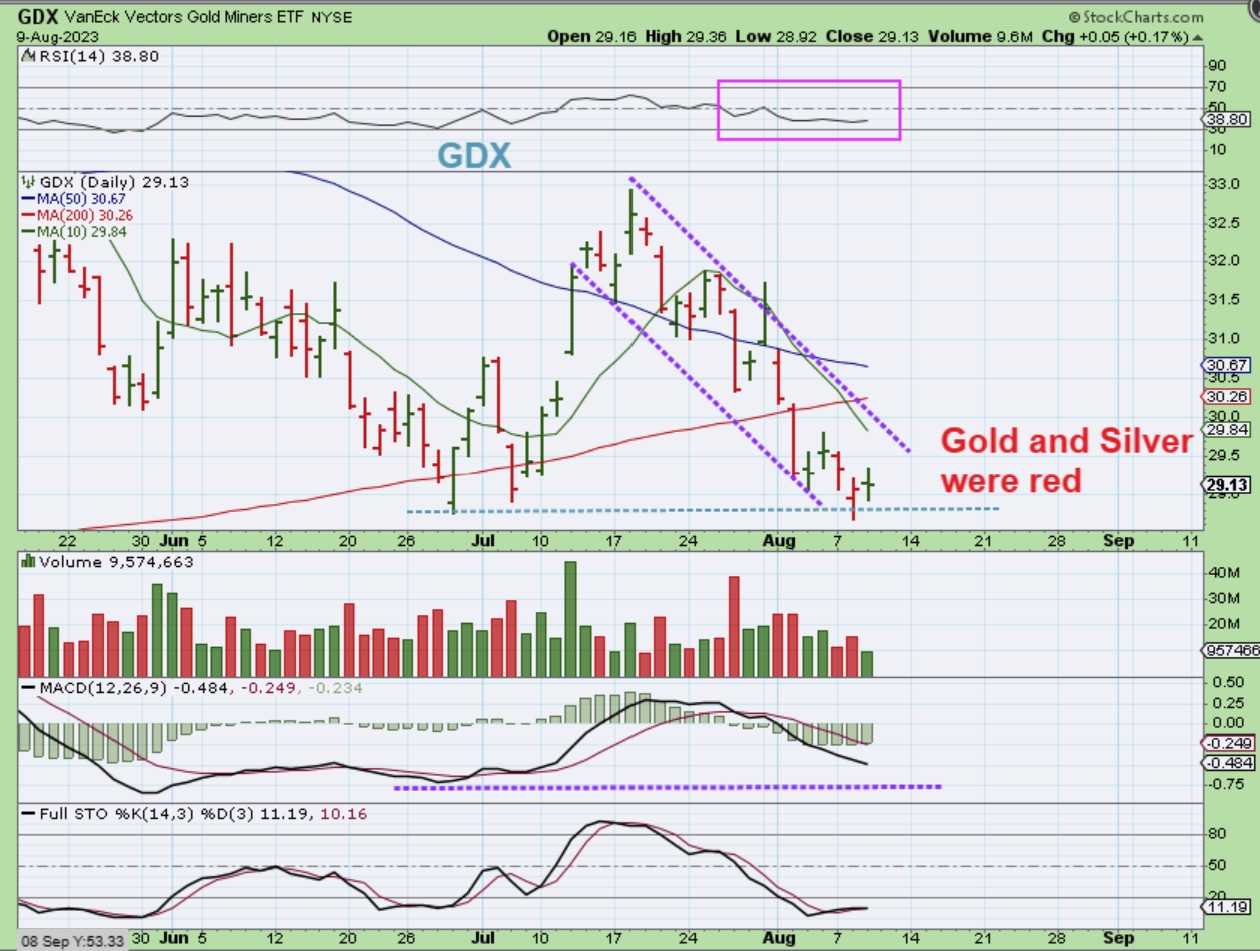 GOLD made a new low yesterday on day 29. The green candle is day 30, Thursday at 5 am ET, as I wrote the report. A dcl can come at anytime and we have CPI numbers today. Notice how Gold dropped, because GDX closed green.