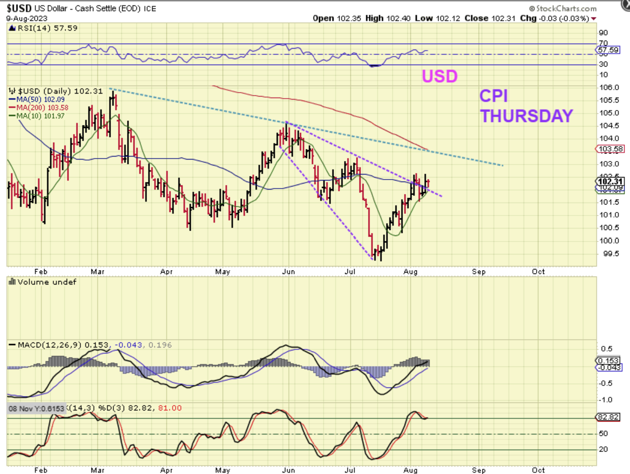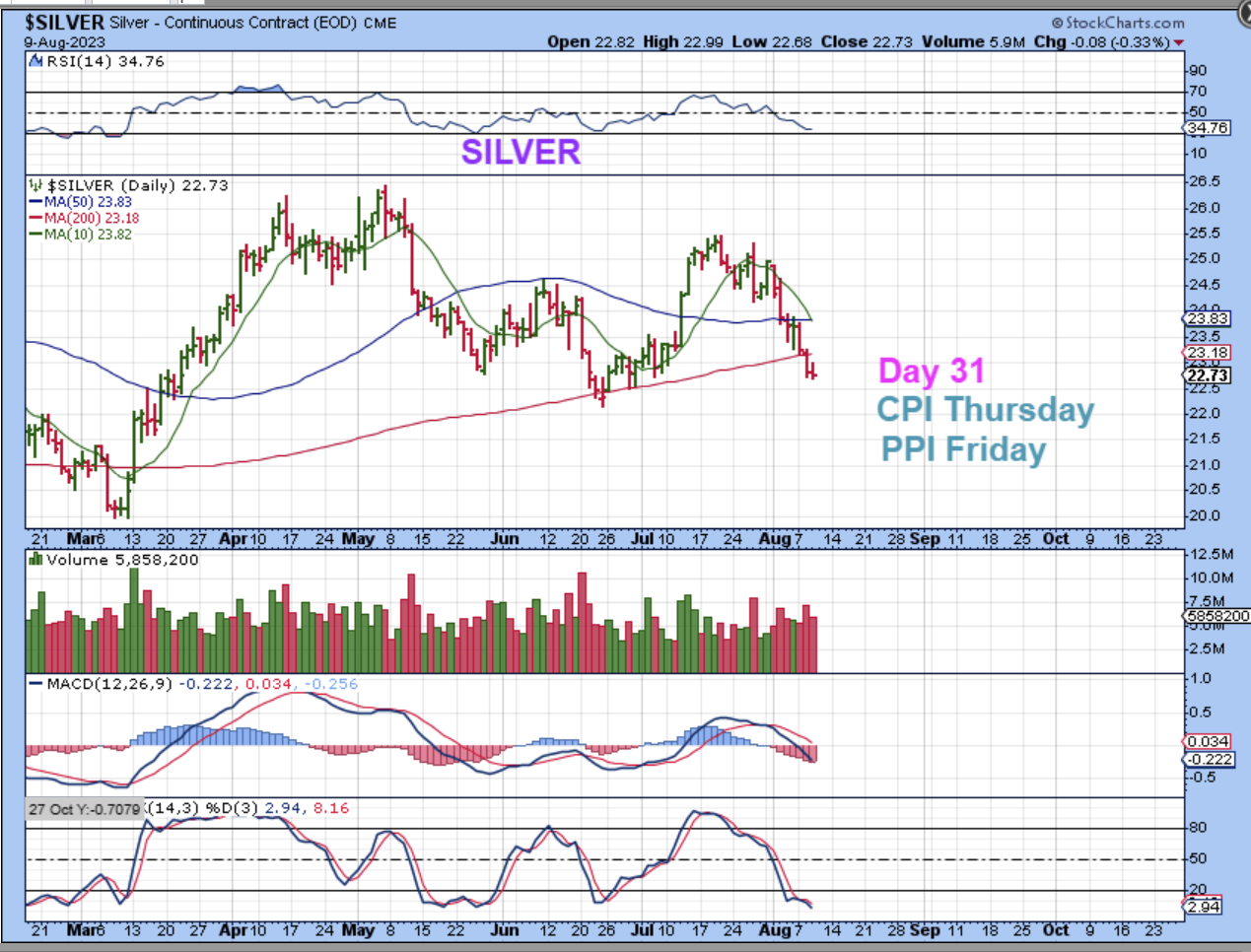 GOLD had a day 28 low and day 29 is Wednesday.  A dcl can form at any time here, because buyers can step in in a Bull run, but usually we see them around day 32. Thursday is day 30 and Friday is day 31. We do see inflation data released on both of those days.