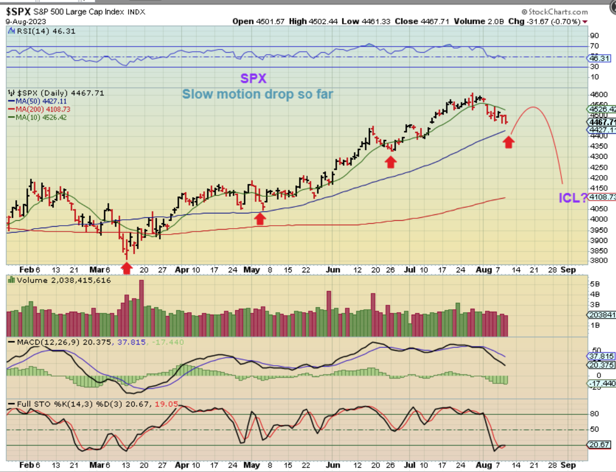 It has been difficult day by day to short this drop, because it is slow and choppy, but we are seeing The SPX dip down into a dcl. We could get a dcl after Thursday & Friday and then move higher – or – we could sell off for another week or 2 also, since ‘timing’ allows for it.  We really just have to allow this to play out.