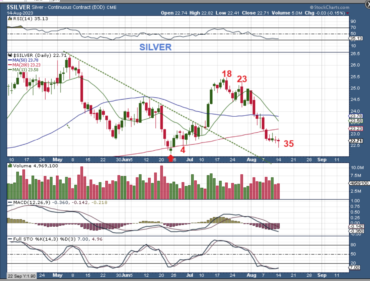 SILVER dropped and put in a reversal candle on Monday. It is almost back down to the June lows and really needs to start moving higher sooner than later.