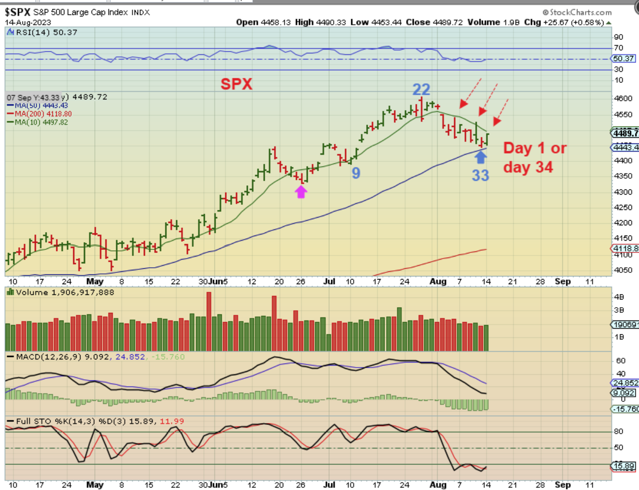 So on The SPX WEEKLY Chart, we see that during bull runs, the 10 week ma often acted as support (Red arrows), but it was the ICL that often broke below that 10sma. Right now we are at the 10 week ma, so we have to be aware of the idea that the markets can dcl here, since we are also on day 33.
