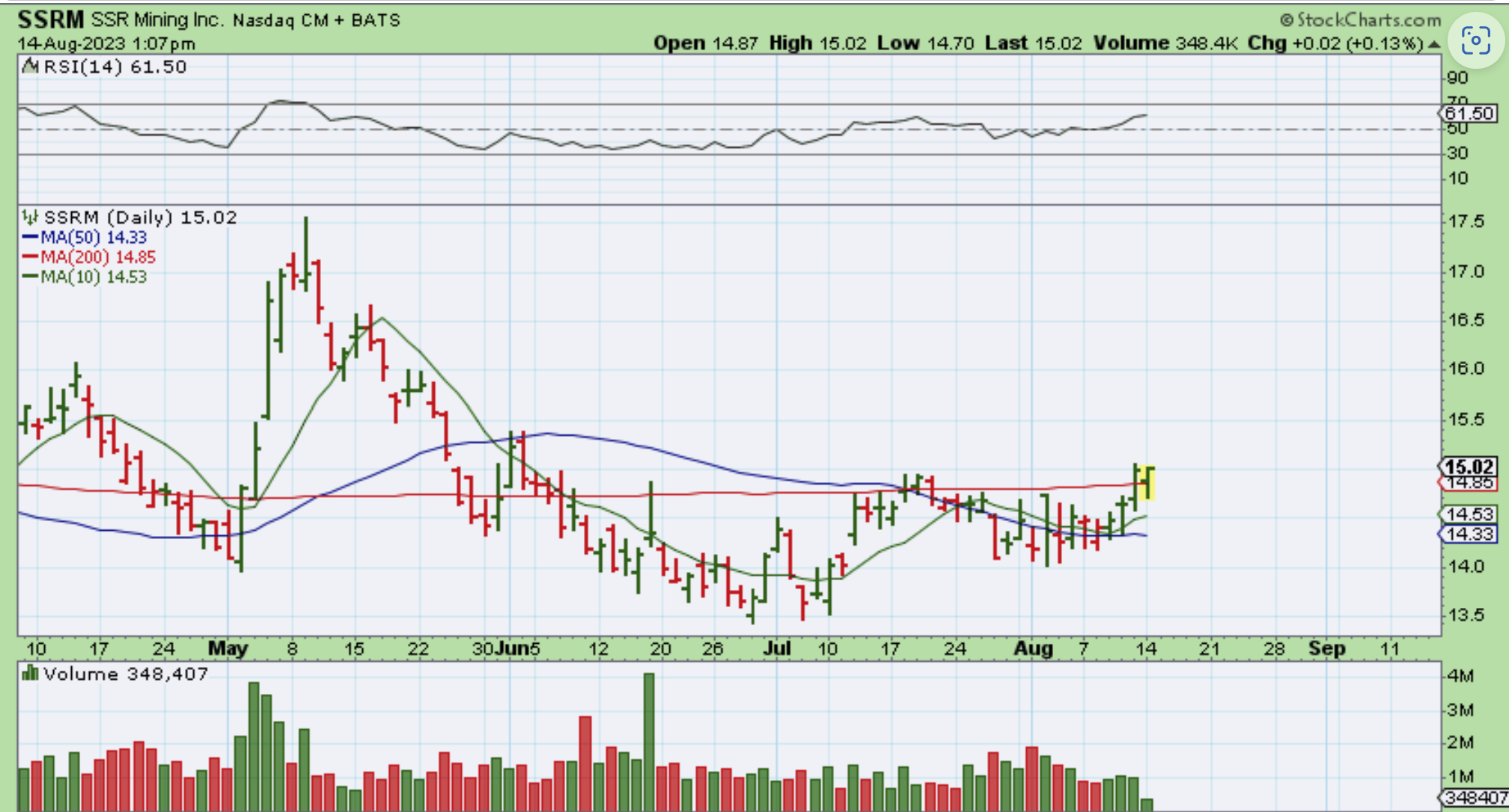 With Silver down, SSRM started to break above the 200sam. By the end of the day it closed a bit lower than where it was here, right at the 200sma.