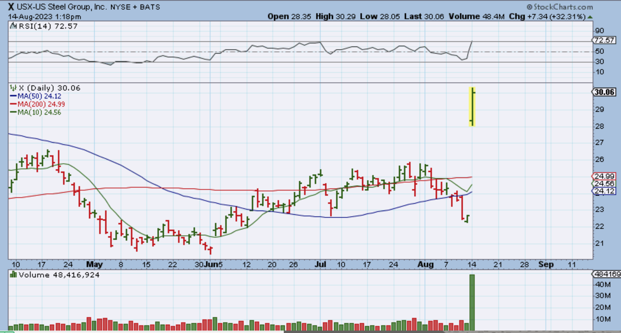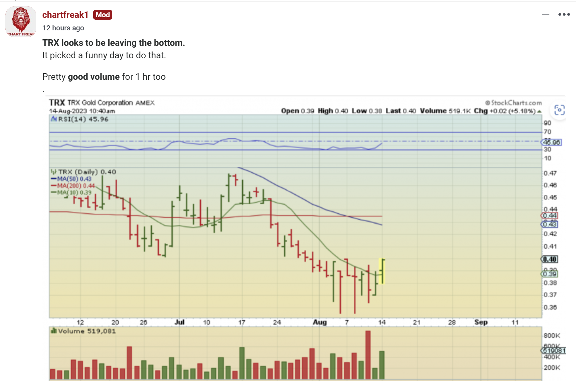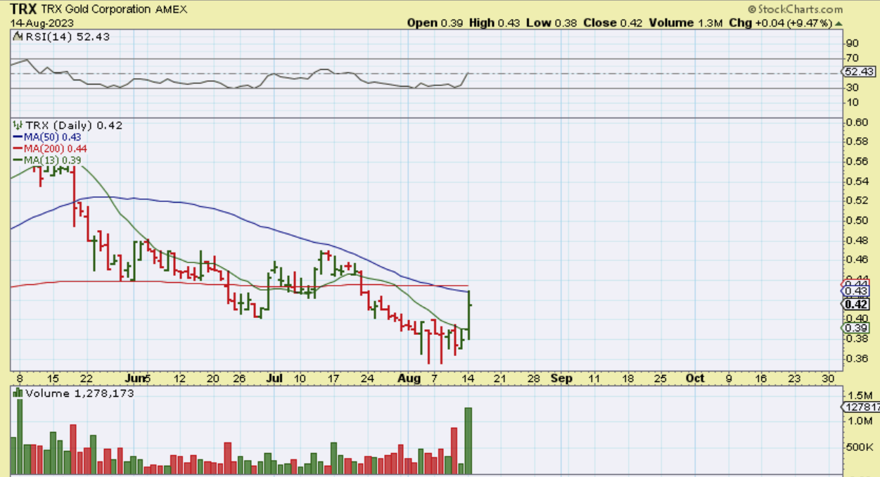 By the close TRX had run all the way up to the 50 & 200sma and then pulled back to ‘Up 9.47 %’. I couldn’t find any news that caused this burst higher.