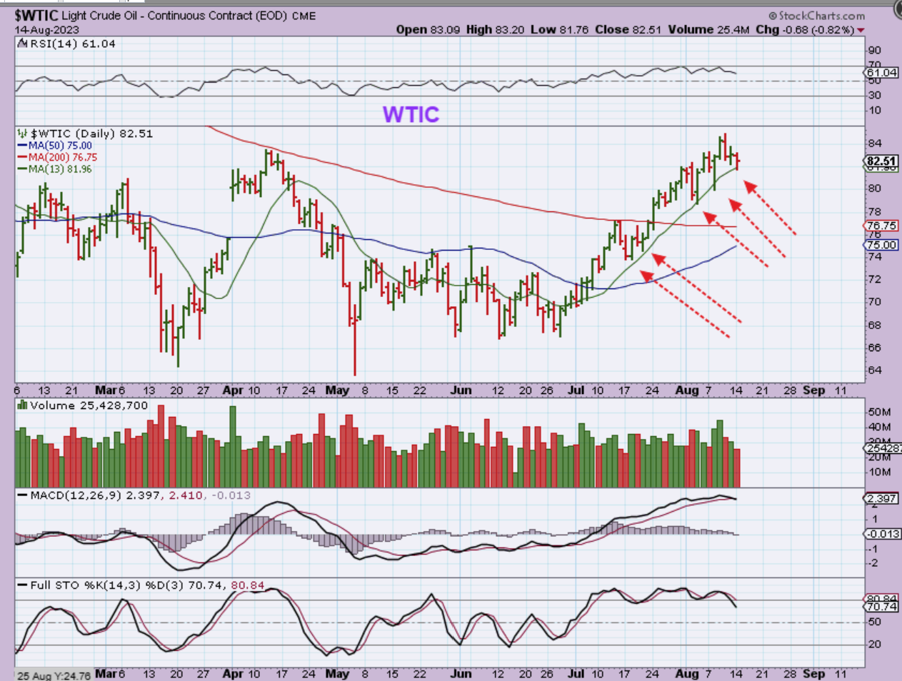 WTIC dipped down to the 13 sma, and that has acted as support, so if that breaks down it might be ready to back test the 50sma as a dcl(?). We’ll see. If so, Oil stocks become a ‘Buy the Dip’ again.