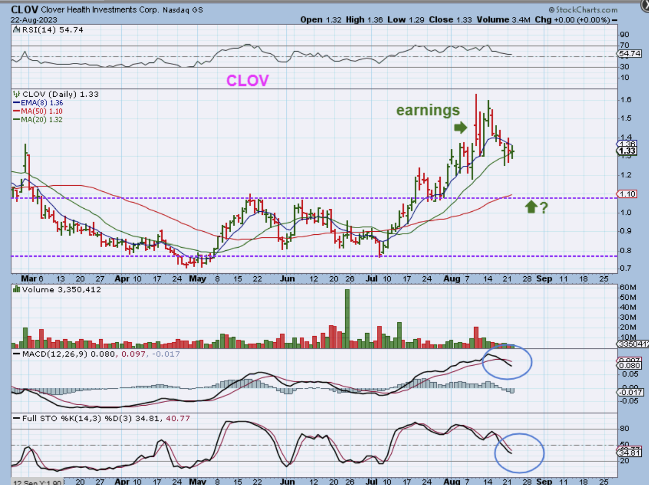 Yes, CLOV is bullish. It has acted bullishly as it moved out of the July lows and 6 month base, but it could still dip a little lower to back test the base & 50sma. It is at the 20sma right now, but it isn’t oversold & the MACD did cross down, so when I look at this I do think that it has a good chance of falling further to the 50sma as support.