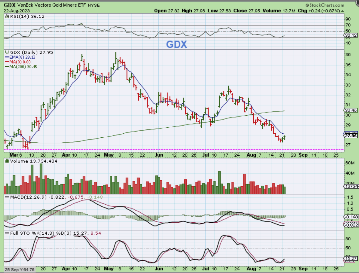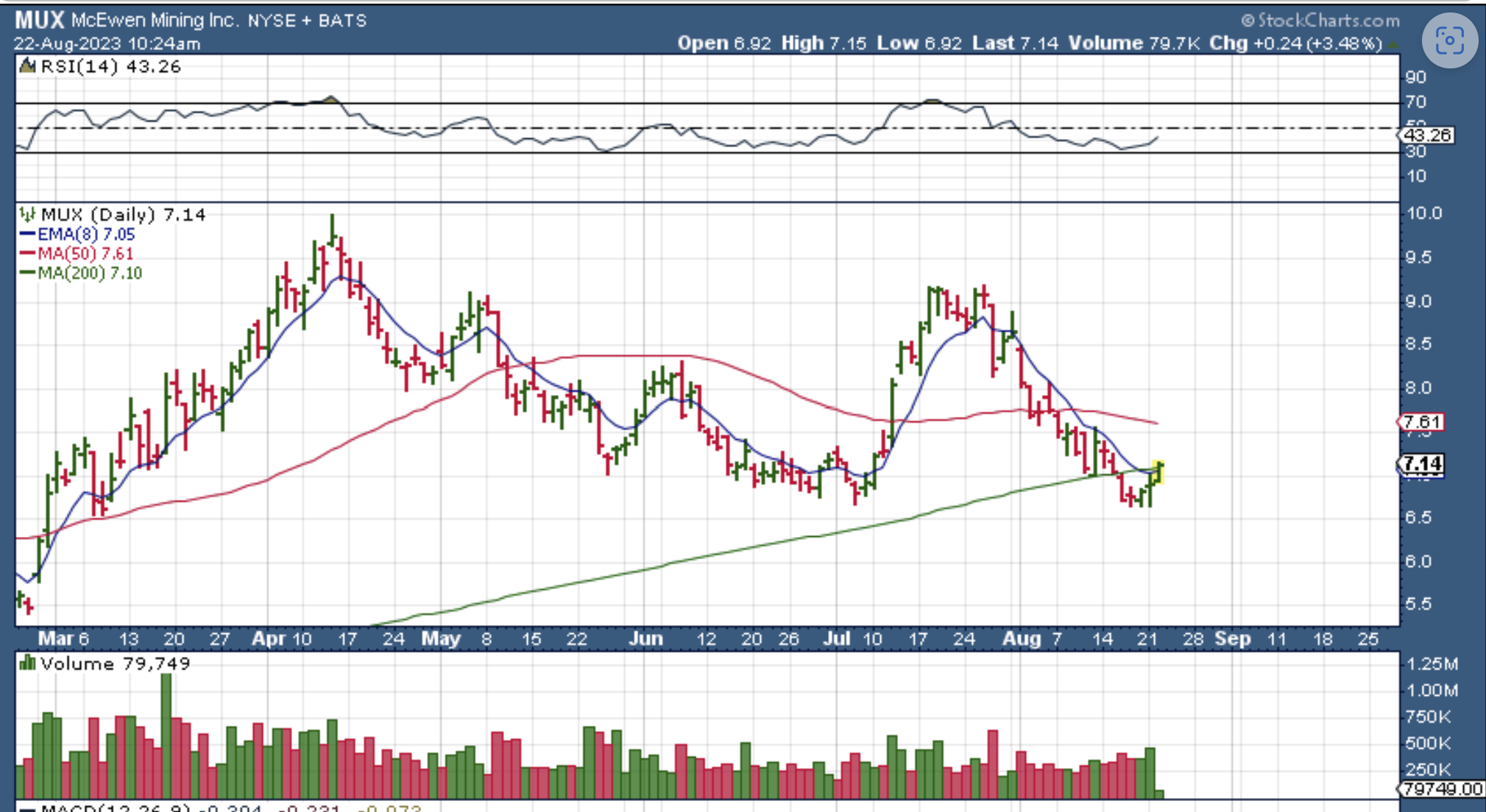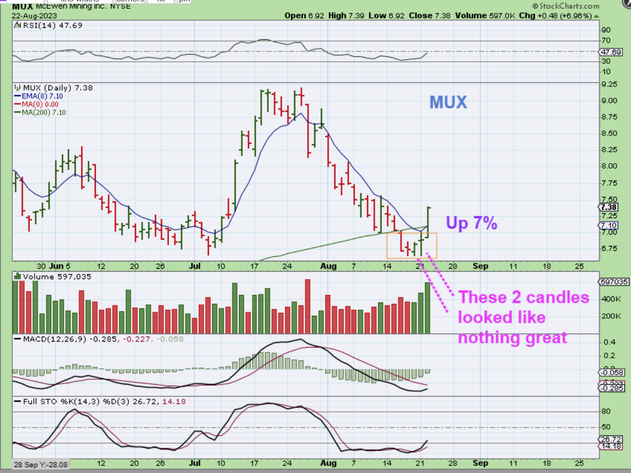 MUX – Notice that the bottom 2 or 3 candles really looked lack-luster. I point that out because many miners do look like that now, but suddenly buyers pushed MUX up 7%. We could start seeing buyers step in now that God and Silver are starting to stand out a little more as likely bottoming.