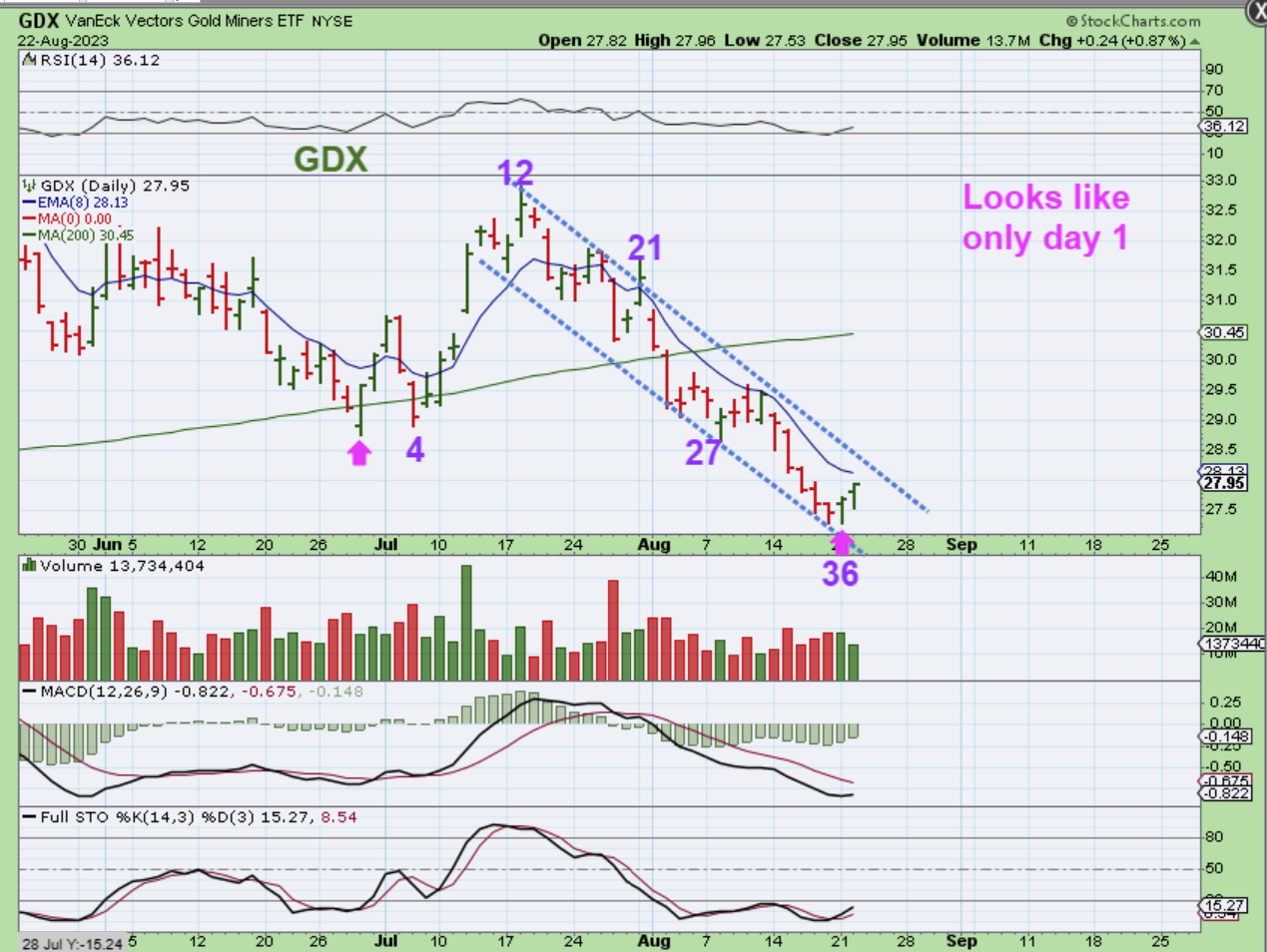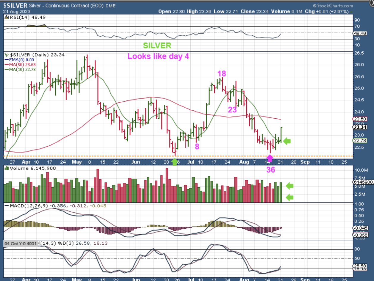 Hello Monday, and it certainly does look to be day 4 for Silver. I do hate that SILJ is not as Bullish as Silver, but that MIGHT be a gift! Silver stocks are hanging at the lows, and could be cheap buys with Silver looking like this.