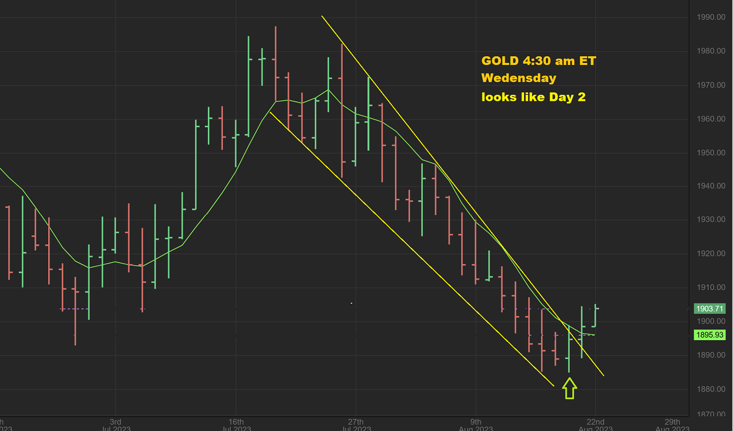 As you can see, GOLD broke that downtrend yesterday and todays candle is already pushing higher. Again, this happened with the USD higher too, so that is encouraging. This looks like Gold day 2.