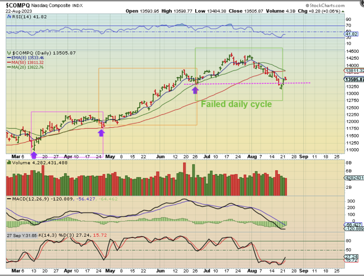THE SPX reversed at the 8 ema (the 10sma is higher), so we just need more time to know if this is a dcl or not. Anyone going short yesterday would want to use a stop at the 10sma. This could actually be day 2 of a new daily cycle.