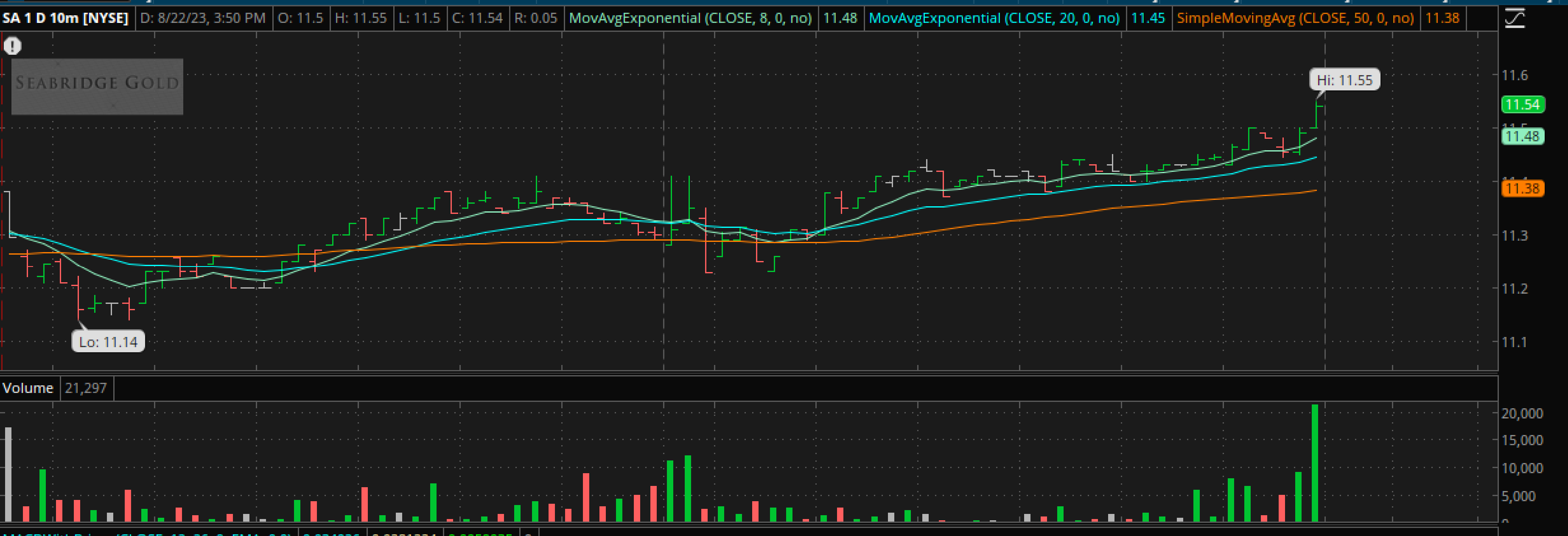 I noticed yesterday that most miners were up 1% or less and simply chopping sideways all day long. Suddenly, in the final hour, several Miners started to Pop, so I grabbed this chart of SA to show that move on a 10 minute chart. What did this move do, if anything?