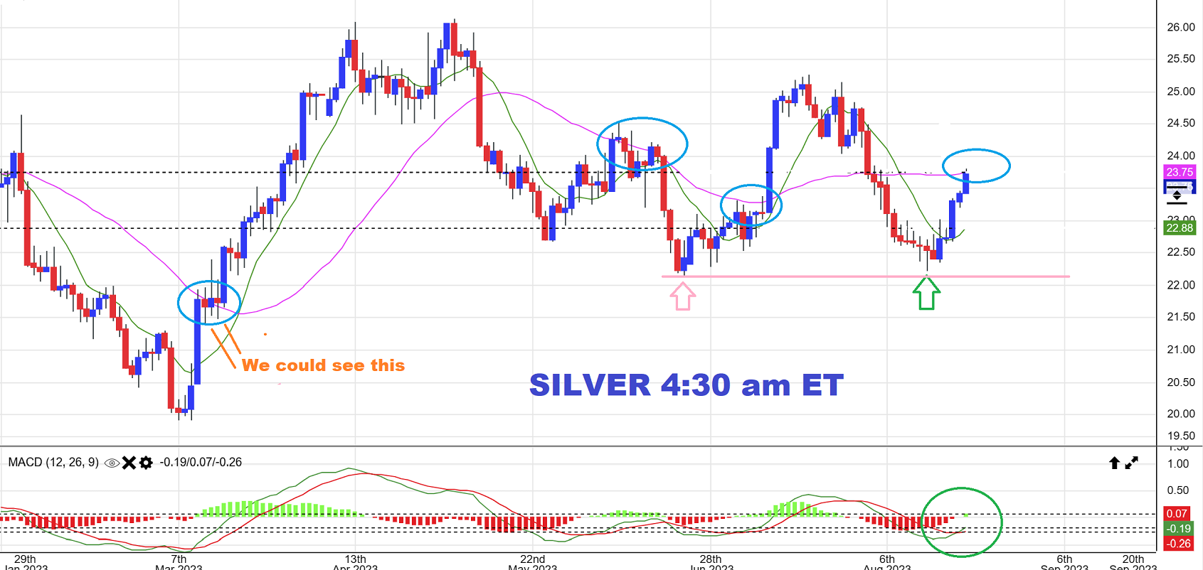 SILVER 4:40 am ET – Silver is starting to surge, but it has reached what has acted as resistance in the past. We might see a little crawl sideways or a pull back after today , we’ll see.  I’d LOVE to see the Silver stocks start playing catch up and make a move like this.