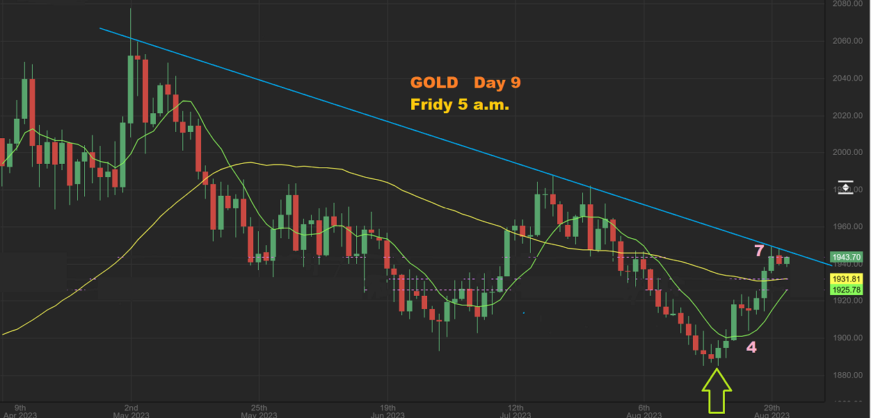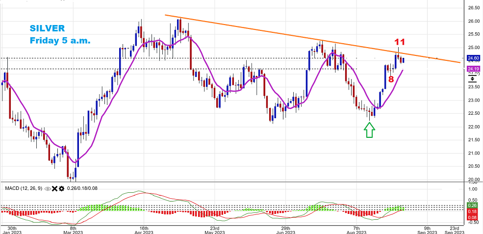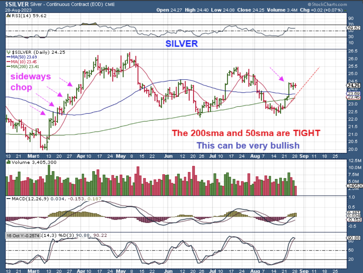 Friday 5 a.m. ET live SILVER – So yes, Silver is crawling sideways to the 10 sma, as expected. It looks to be preparing to break out higher too.