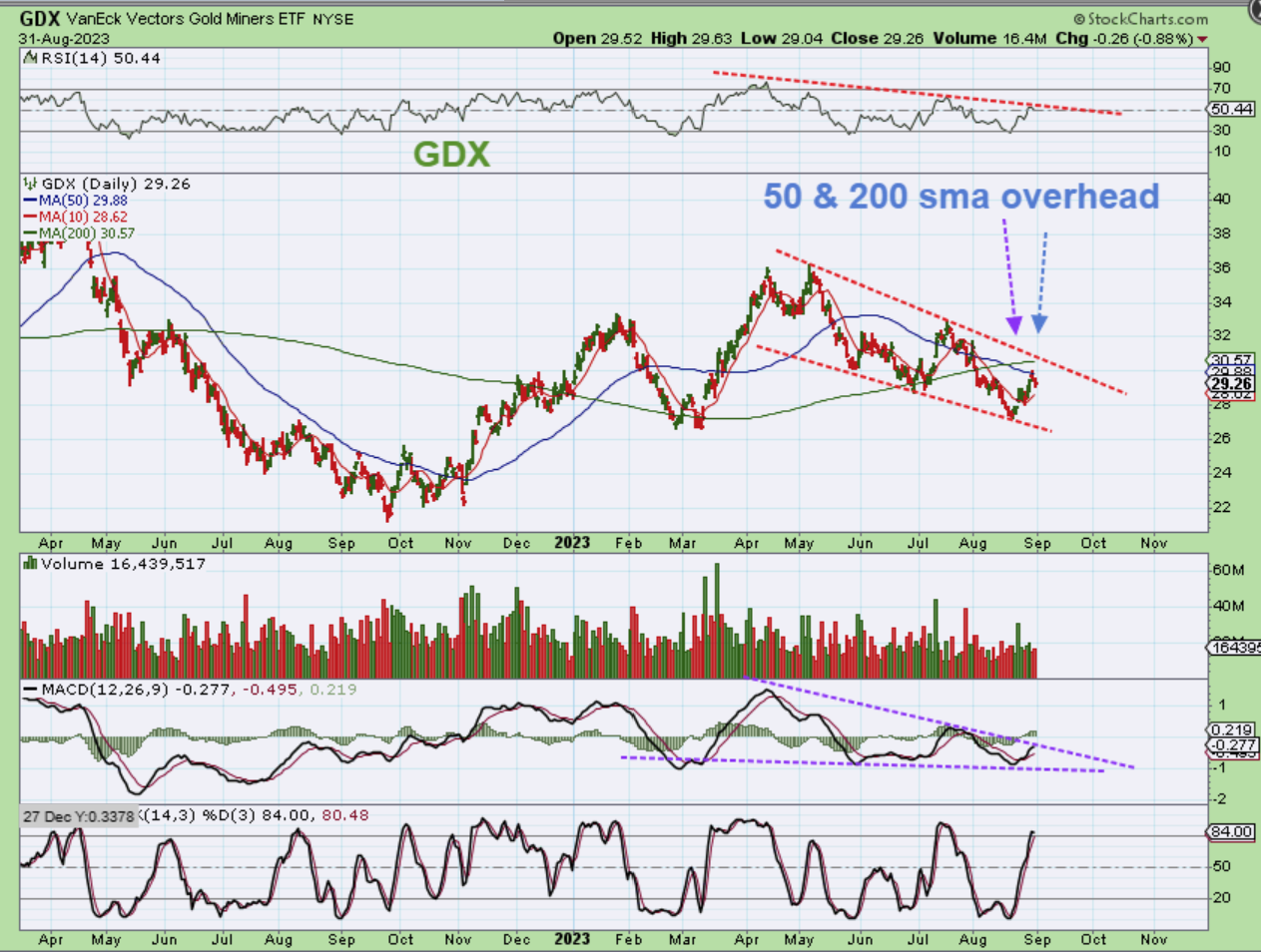 Here we see that The GDX ETF ran up to the 50sm and stalled. It also has overhead resistance with the 50 & 200sma, but I do like the wedges on the RSI & MACD. We just need a good push for this to break out and then we should be off to the races. Gold and Silver have trend lines overhead to break too, so when they break out, Miners will likely run.