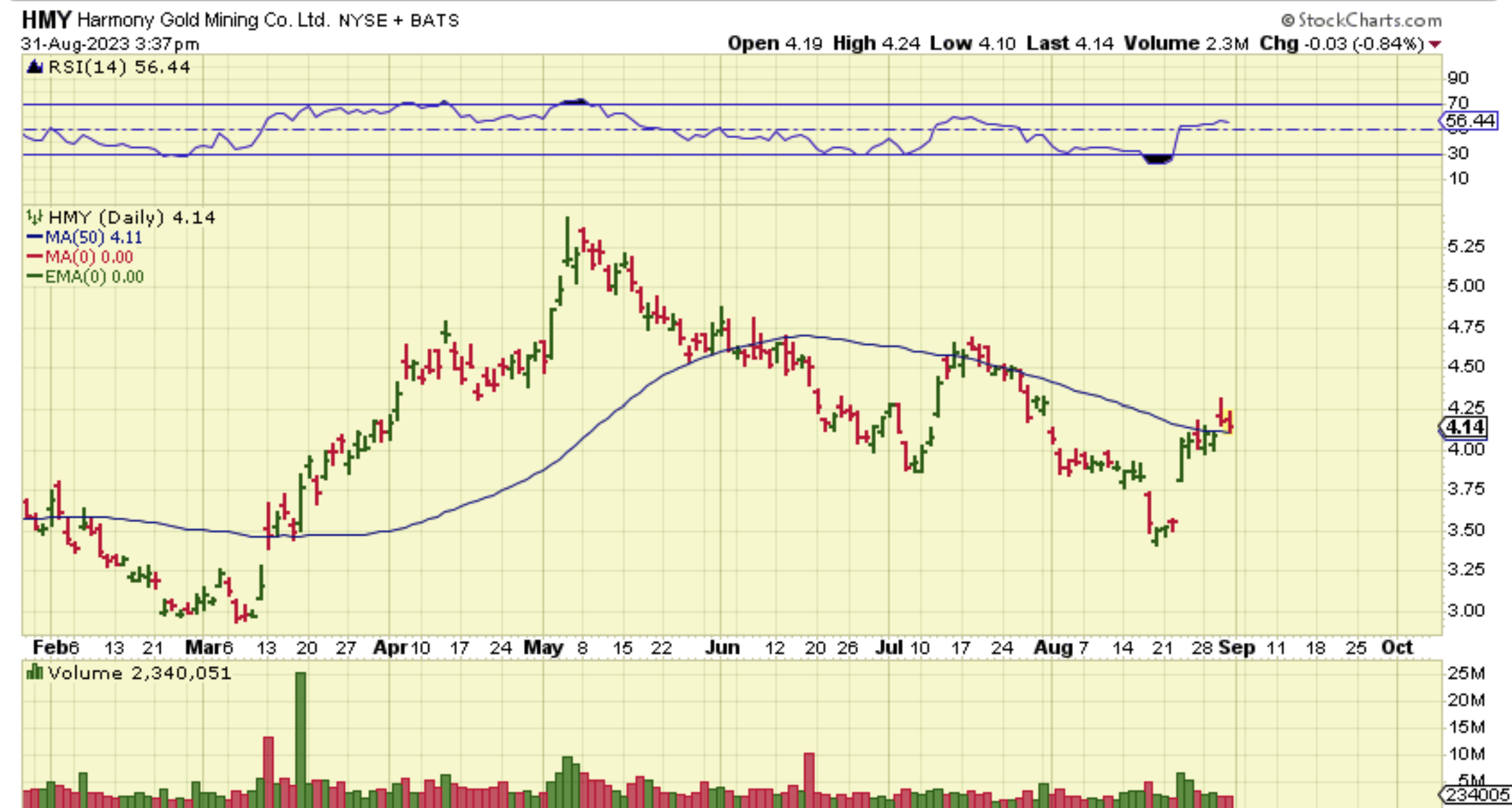 HMY has back tested the 50sma.