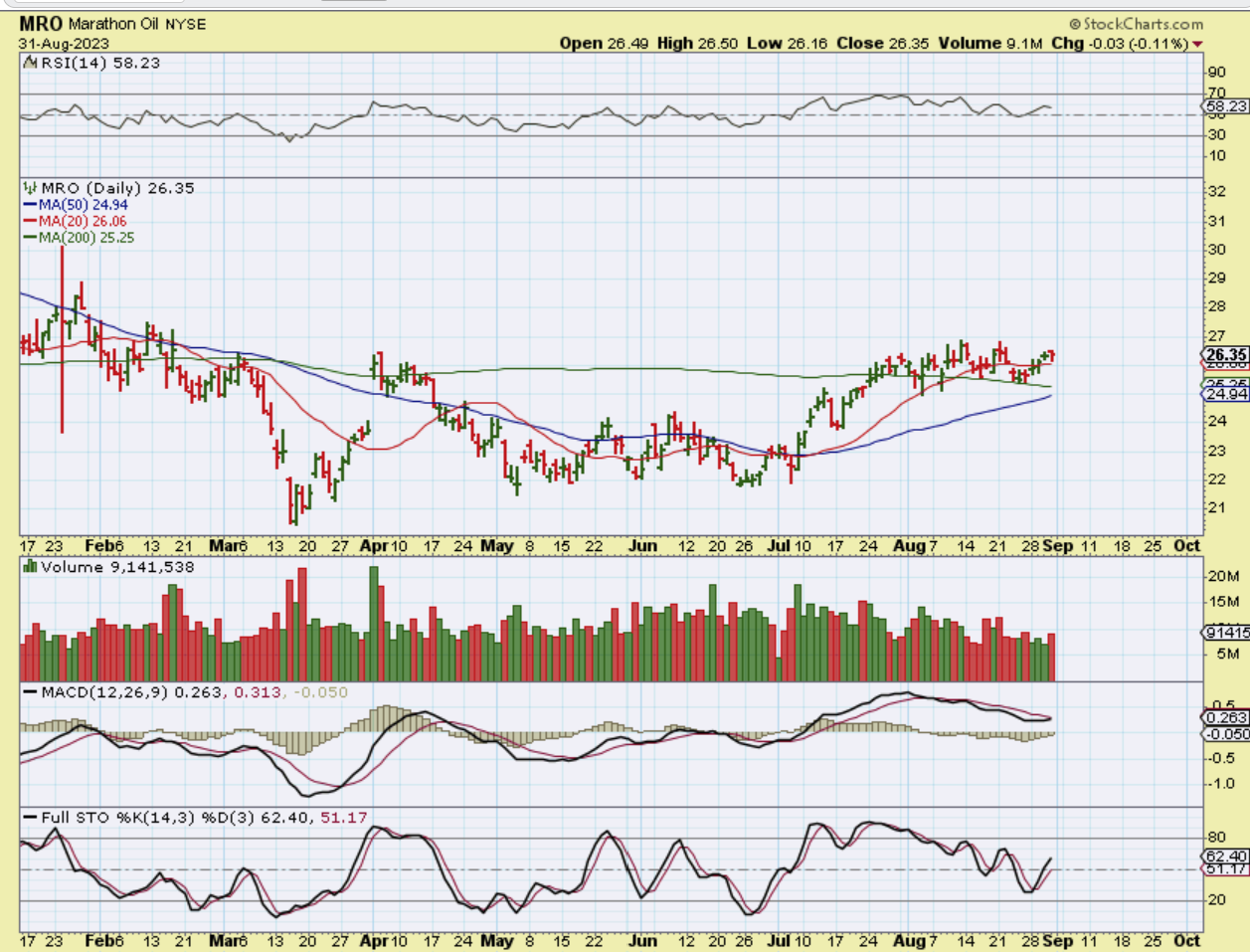 I looked at a few of the Oil stocks and again, they didn’t pull back as much as Oil.  Some are climbing their 20 or 34 sma, and others like MRO have been chopping sideways while back testing the 200sma. They do remain bullish in the choppiness.