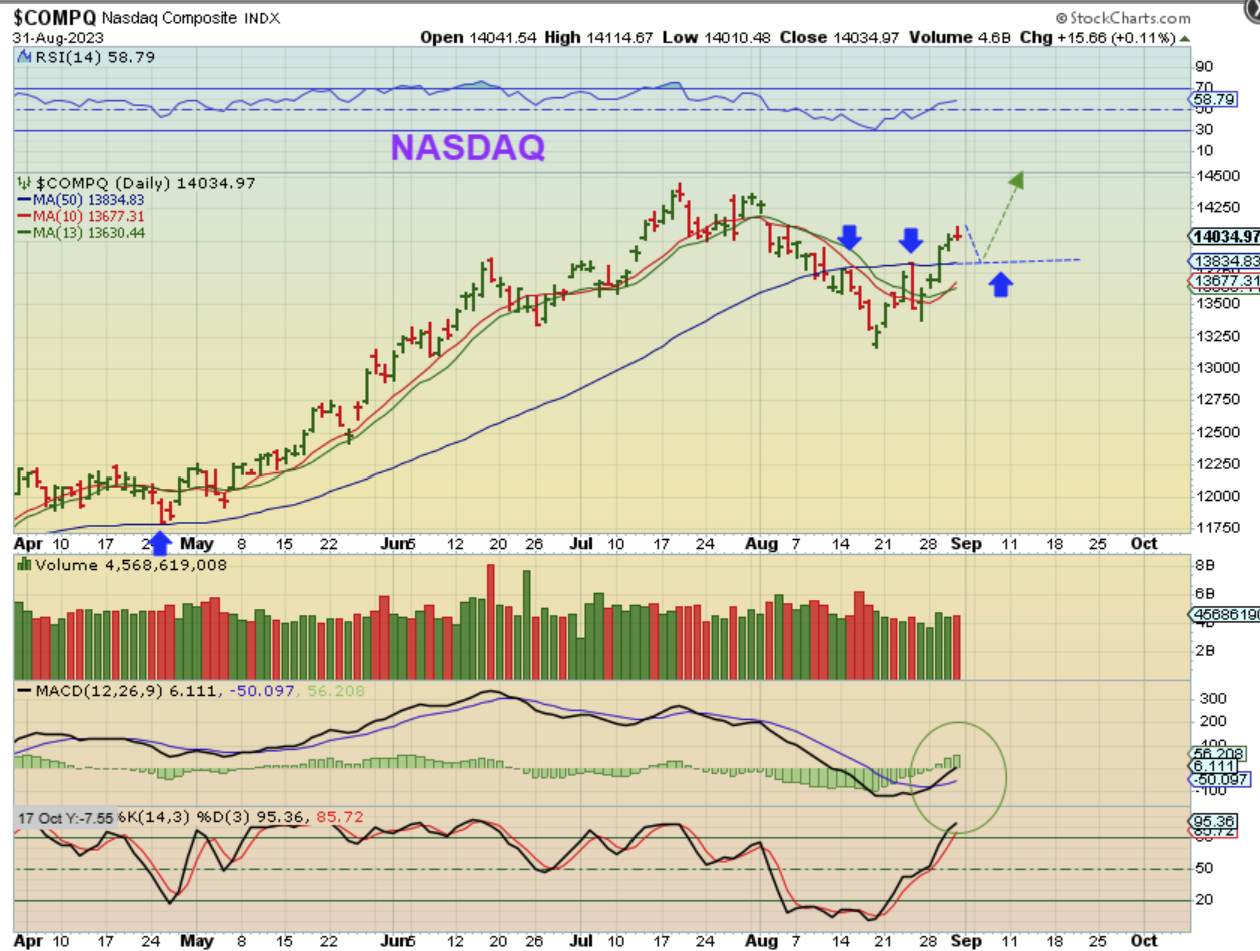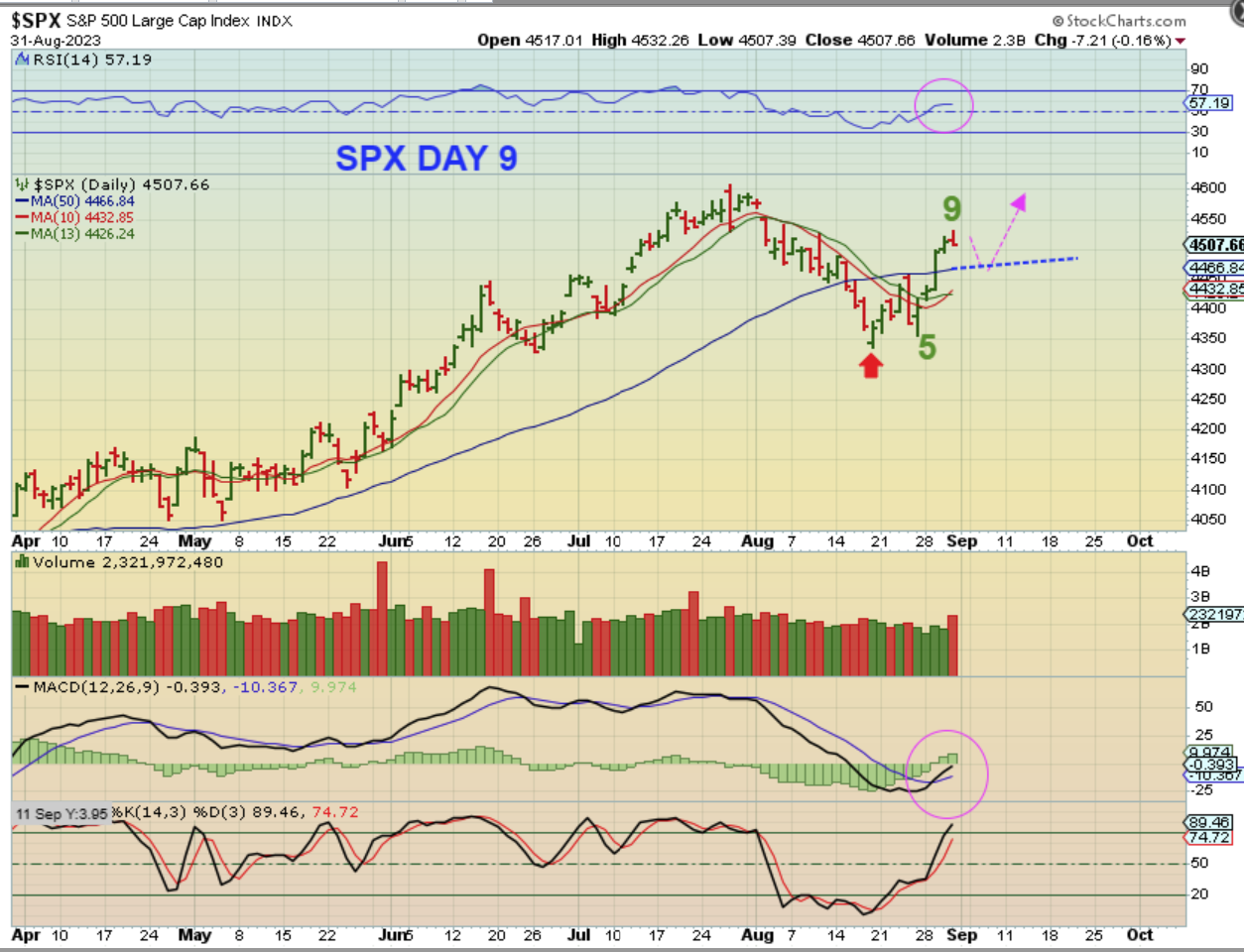 The SPX is on day 9 and it also popped and dropped into the close, so a back test is possible, we’ll see.  The RSI and The MACD are bullish and things look good going forward.