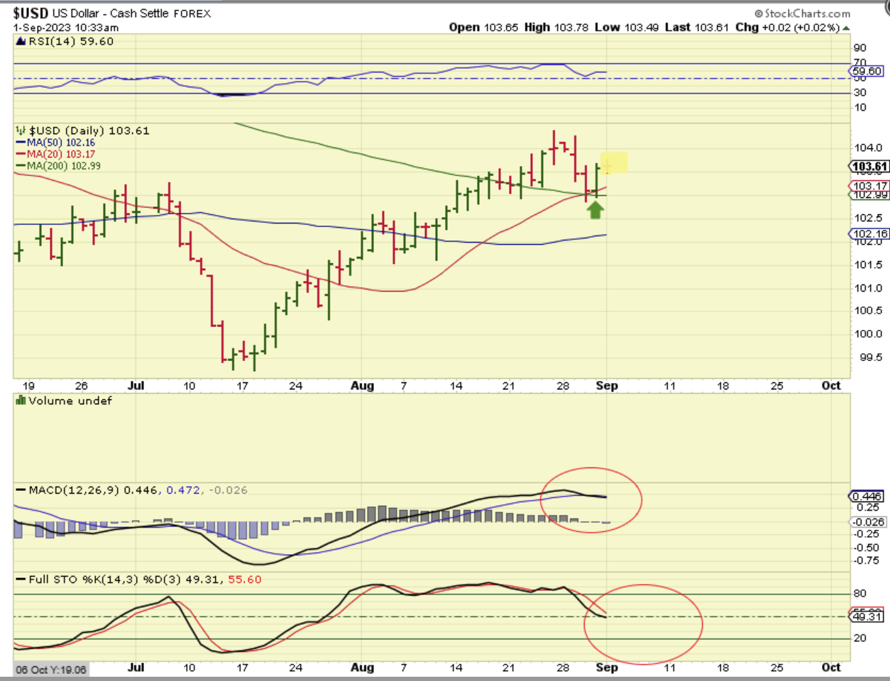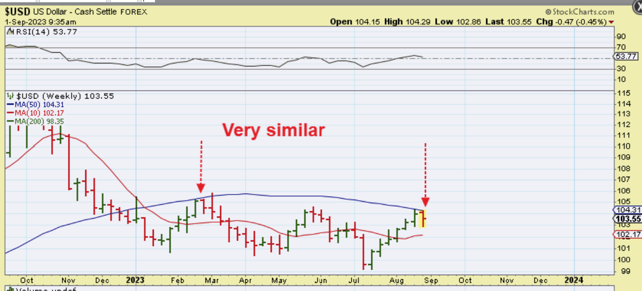 When I use OHCL price sticks, The USD Weekly looks very similar to the last time it tagged this 50 week ma. It bounced for 1 more week and then rolled over.