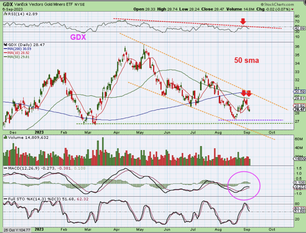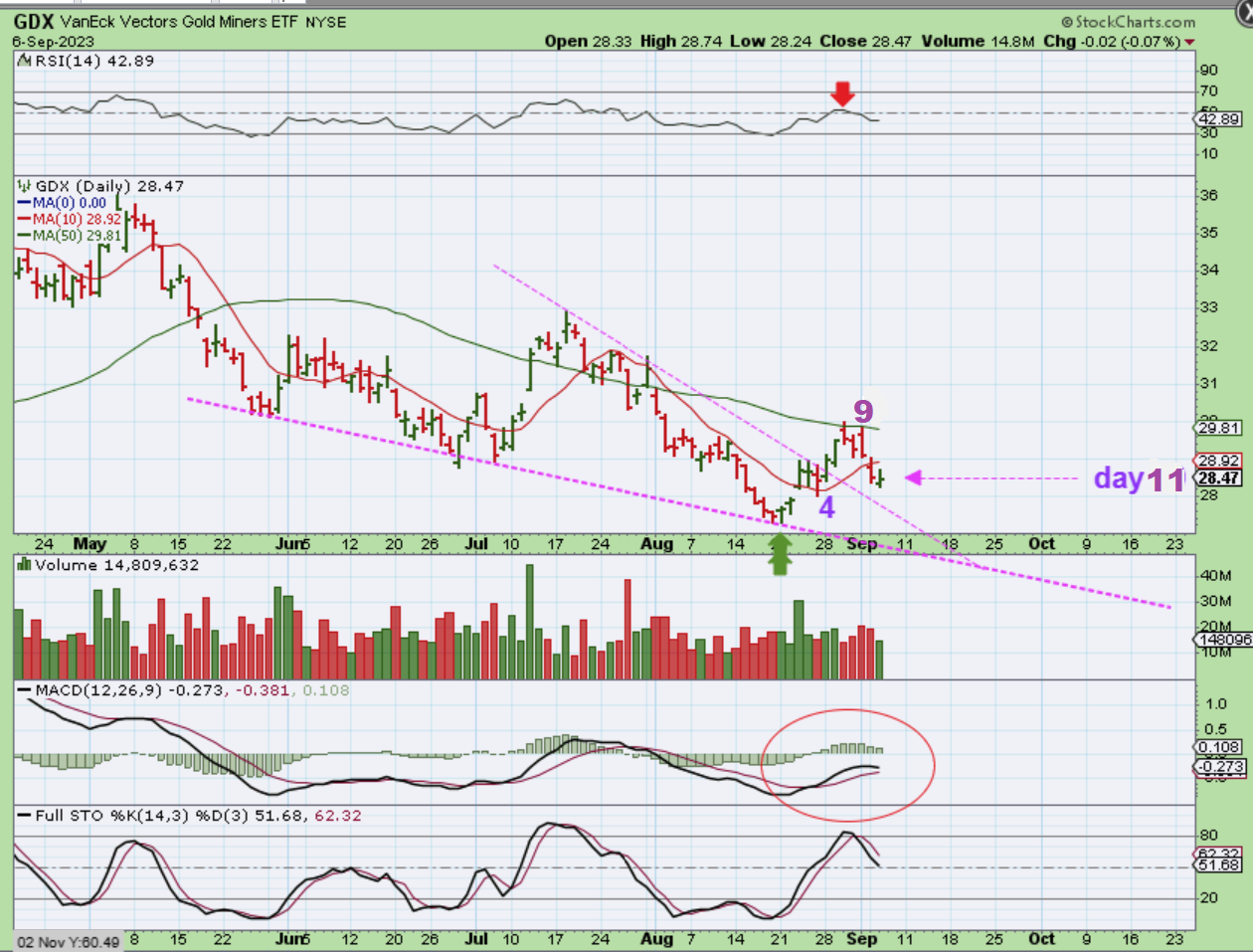 GDX was rejected at the 50sma on 2 separate days and then lost the 10sma. The MACD looks good, but the RSI was stopped at the 50% area so far. This looks like day 11 for The GDX. If Gold and Silver push higher, this may try to get above that 50sma again. If they chop sideways, we can expect the same here.