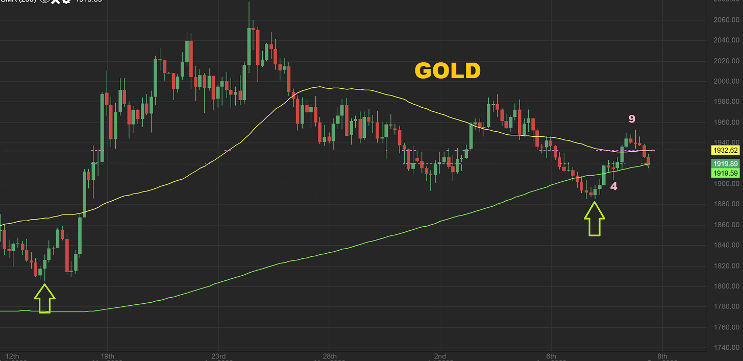 GOLD is trying to hold up, but on day 12 it pierced the 200sma. If the USD rallies, it does seem like Gold could break down. If the USD chops around under $1.06, the Gold could chop around up here. NOTE: IF I DID NOT INCLUDE THE USD IN MY ANALYSIS, I would simply say that so far Gold is still bullish.
