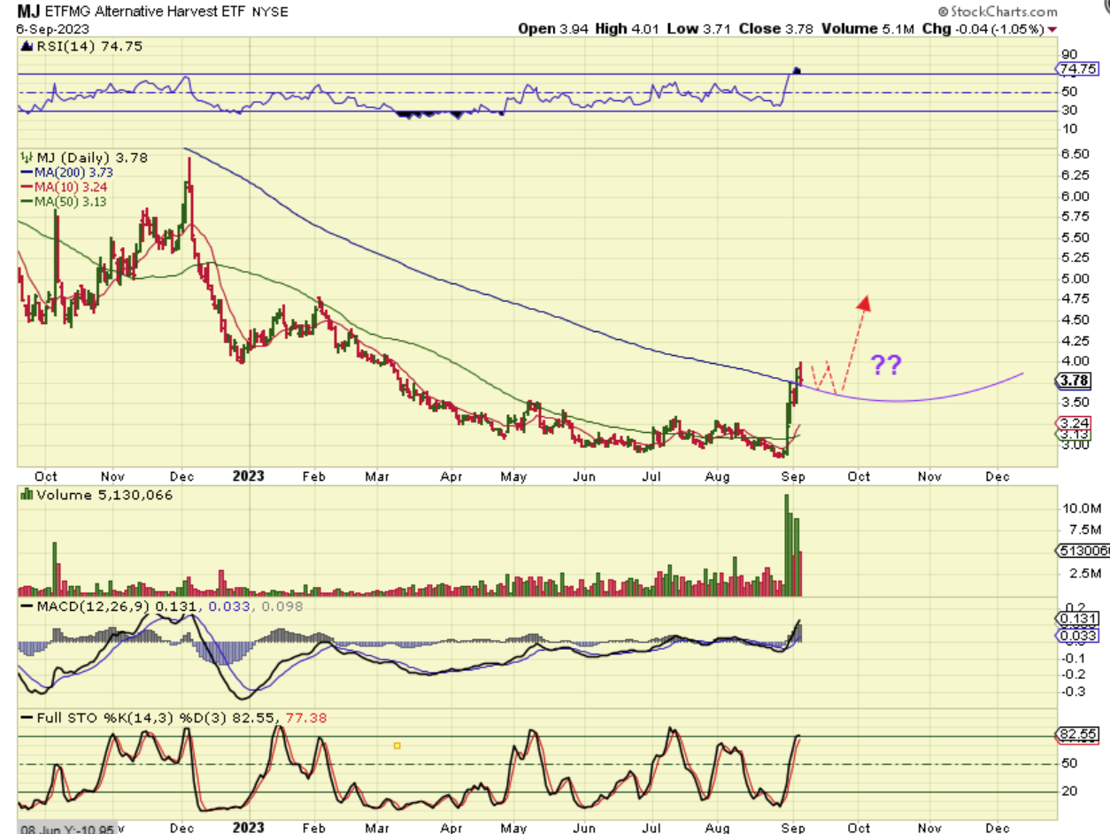 MJ still has this move out of the base that is worth watching  (or for some, maybe trading it short term). Will it consolidate with a bull flag and go again? Or break down? It is worth watching. Uranium rallied too.