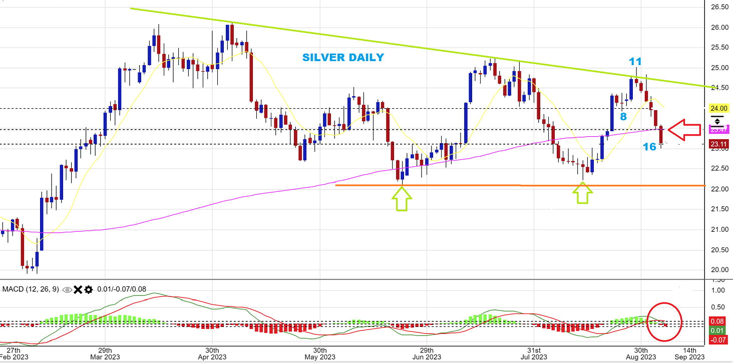 SILVER lost the 200sma, and that is a bit discouraging. The Silver miners never performed as well as Silver, so it is as though ‘someone’ knew that Silver wasn’t ready to break out and run yet. So what do we currently have with Silver?