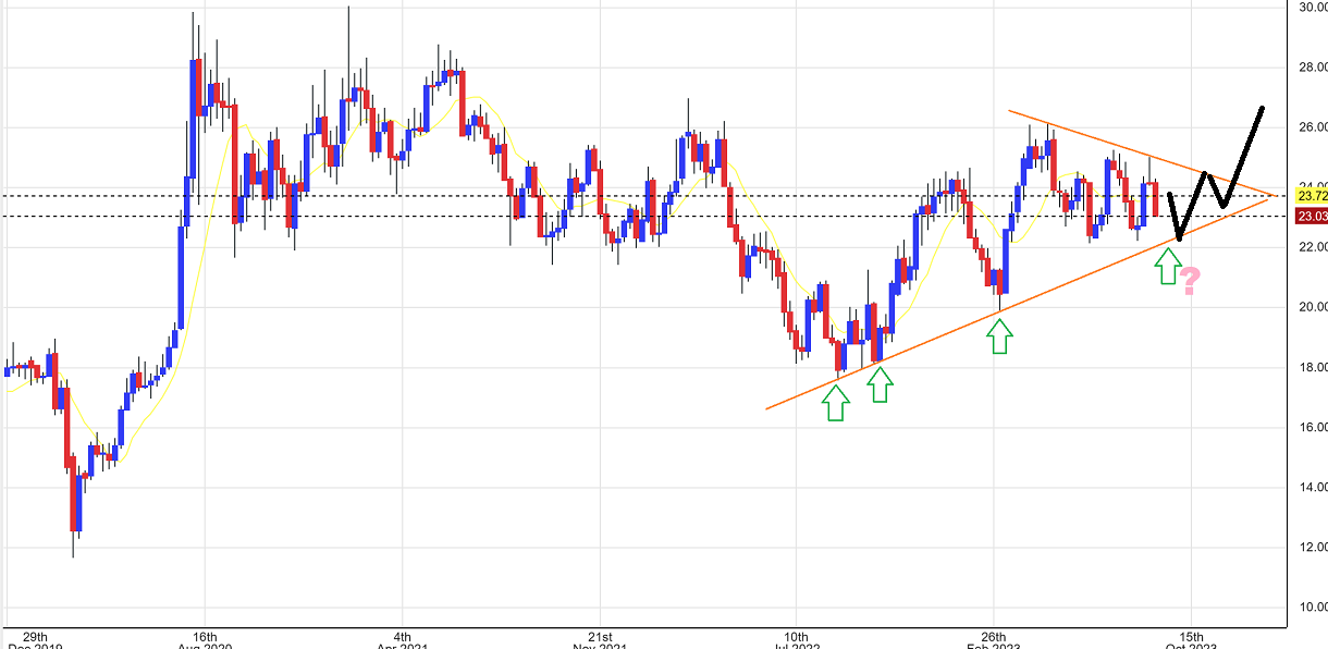 Yes, it could. I stepped back and found this uptrend line that lands right where the May & July lows would be. So yes, we may see Silver return to the lows, and THEN we’ll see if the Silver miners start to perk up as Silver bounces back up to the top of this triangle.