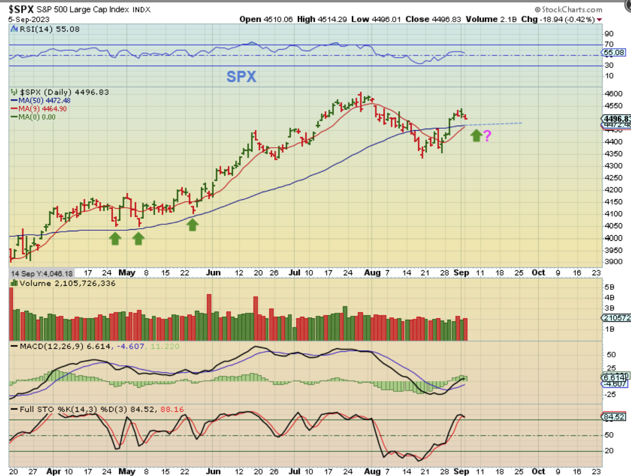 FROM YESTERDAYS REPORT: SPX – The USD popped and then dipped a little, while the General Markets dropped slightly. The chart makes it look like will back test the 50sma (& the 9 or 10sma too).