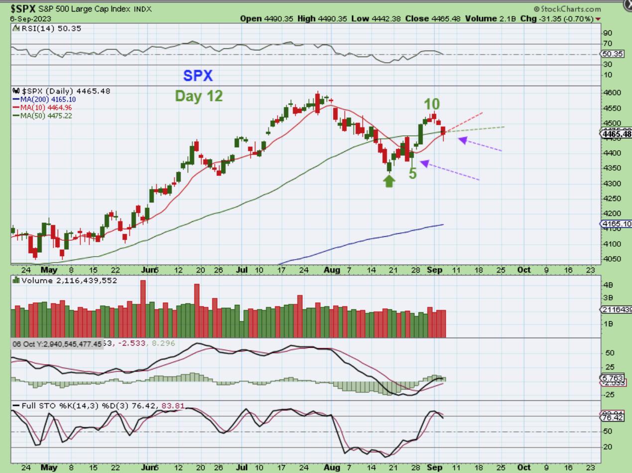 THE SPX dropped deeper than I expected, but it did start to recover into the close. So when I discuss this chart as is, it is bullish and we have a dip into day 12 with a slight break and recovery of the 10 & 50sma. This is fine as is. In fact, it looks like day 5, but I do wonder if the strength of the USD will hinder market progress? So far it hasn’t, but I’m watching for that possibility.