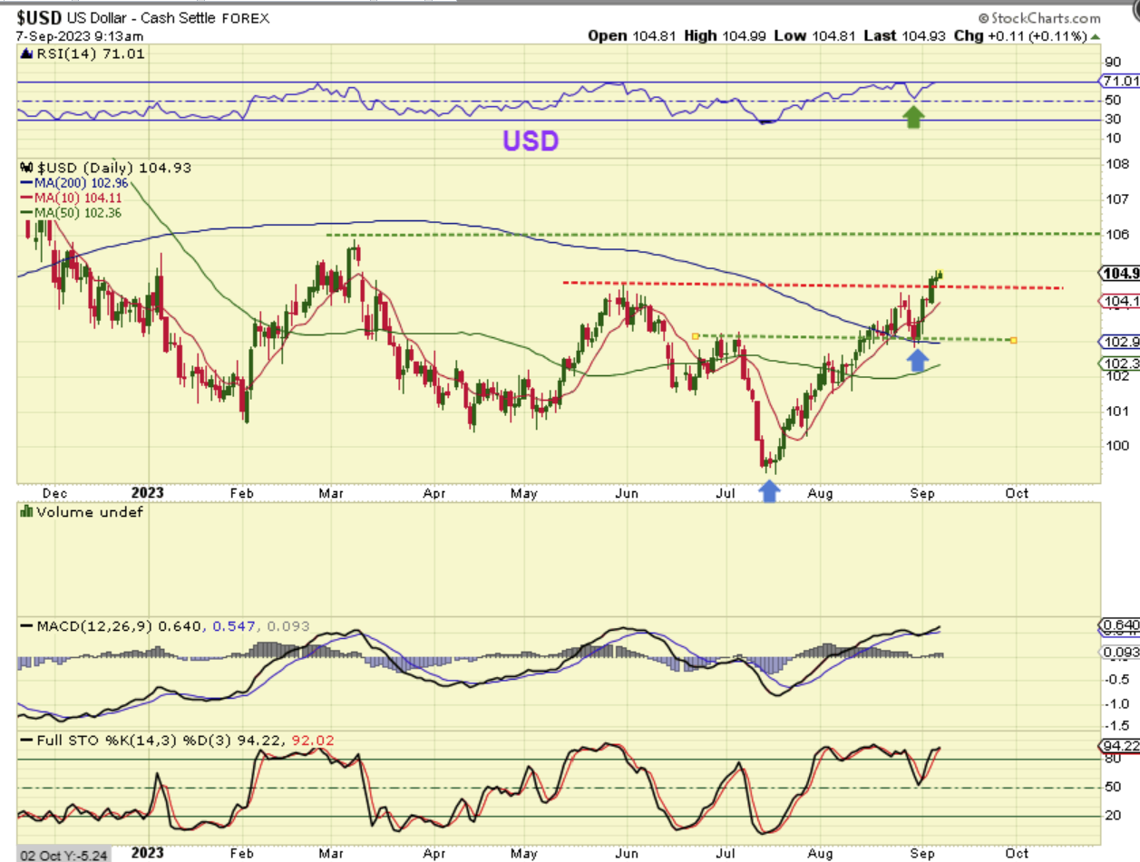 – Has the Fed Rate Hikes and other factors caused the USD to put in a 3 yr cycle low 6 months early? I think that a break of the 106 green line would convince me that it has. Let me show you what I am thinking here…