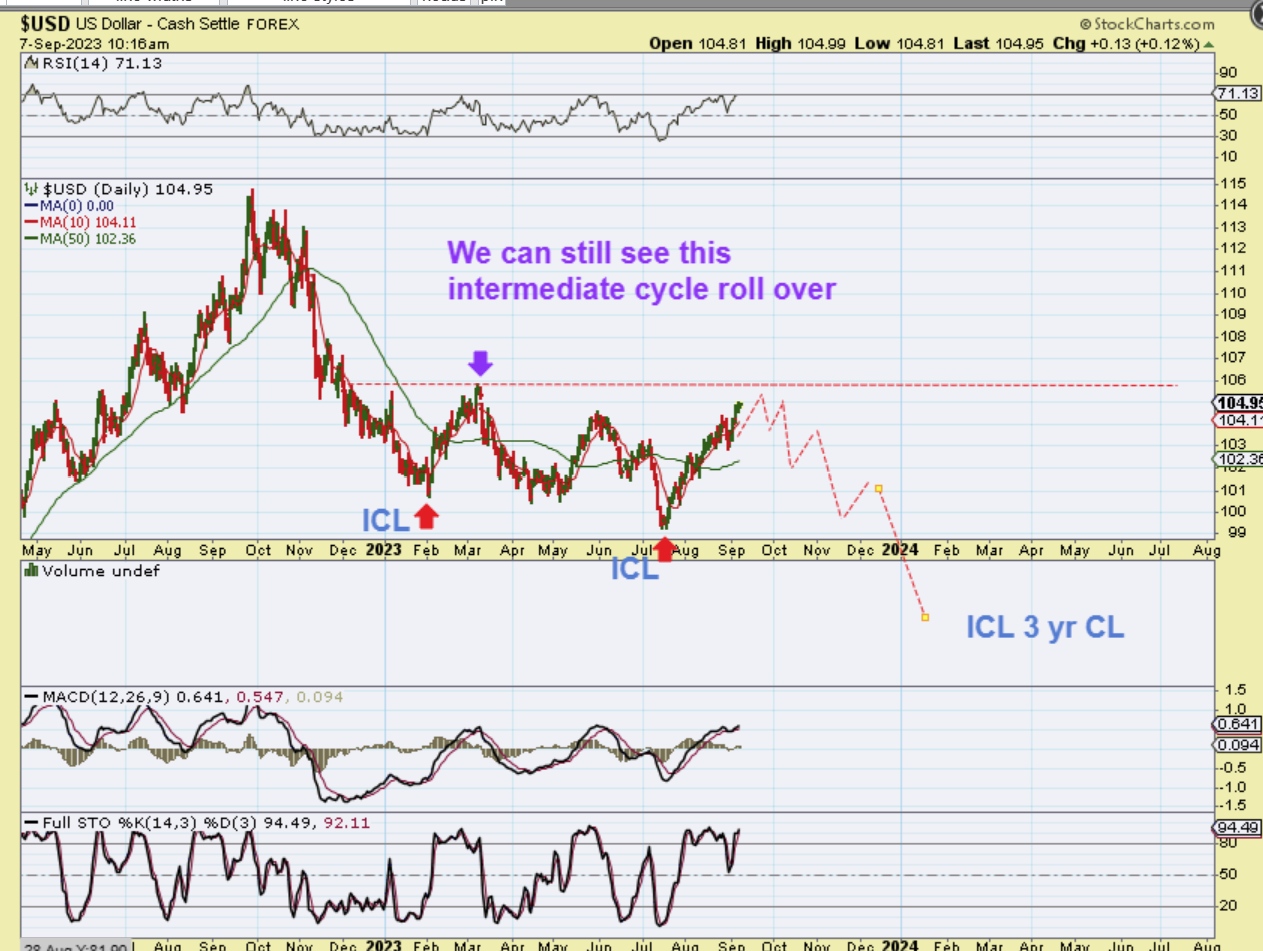 The USD looks to have a crash into an ICL in February. That was followed by a drop into May and then a false rally that rolled over into a July ICL. It doesn’t seem that those Mays lows were an ICL, since the July lows were only 2 months later. So what I am saying is that until we get above that March high we would still have a lower intermediate high. The USD could chop under $106 in this 2nd daily cycle and then drop in a 3rd & 4th daily cycle.  SO FAR, GOLD & SILVER are trying to hold up until this rolls over.