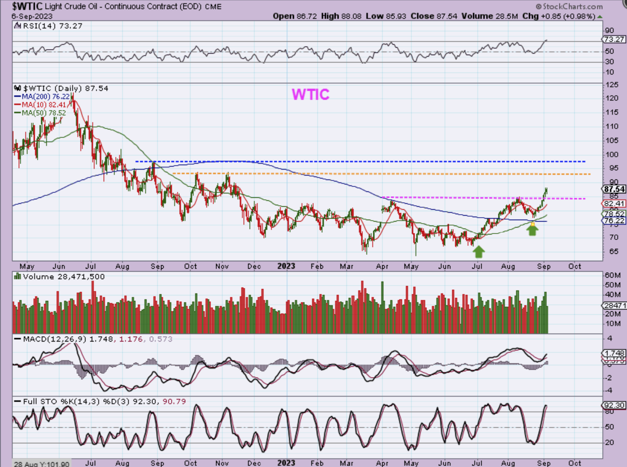 WTIC – So Oil could pull back to the magenta line when the 10sma gets there, or Oil can keep running to the yellow line and then pull back to the 10sma after that. So far Oil went from a Horribly choppy bottom to Bullish. Take a look at that bottoming process again on this chart. With that in mind…