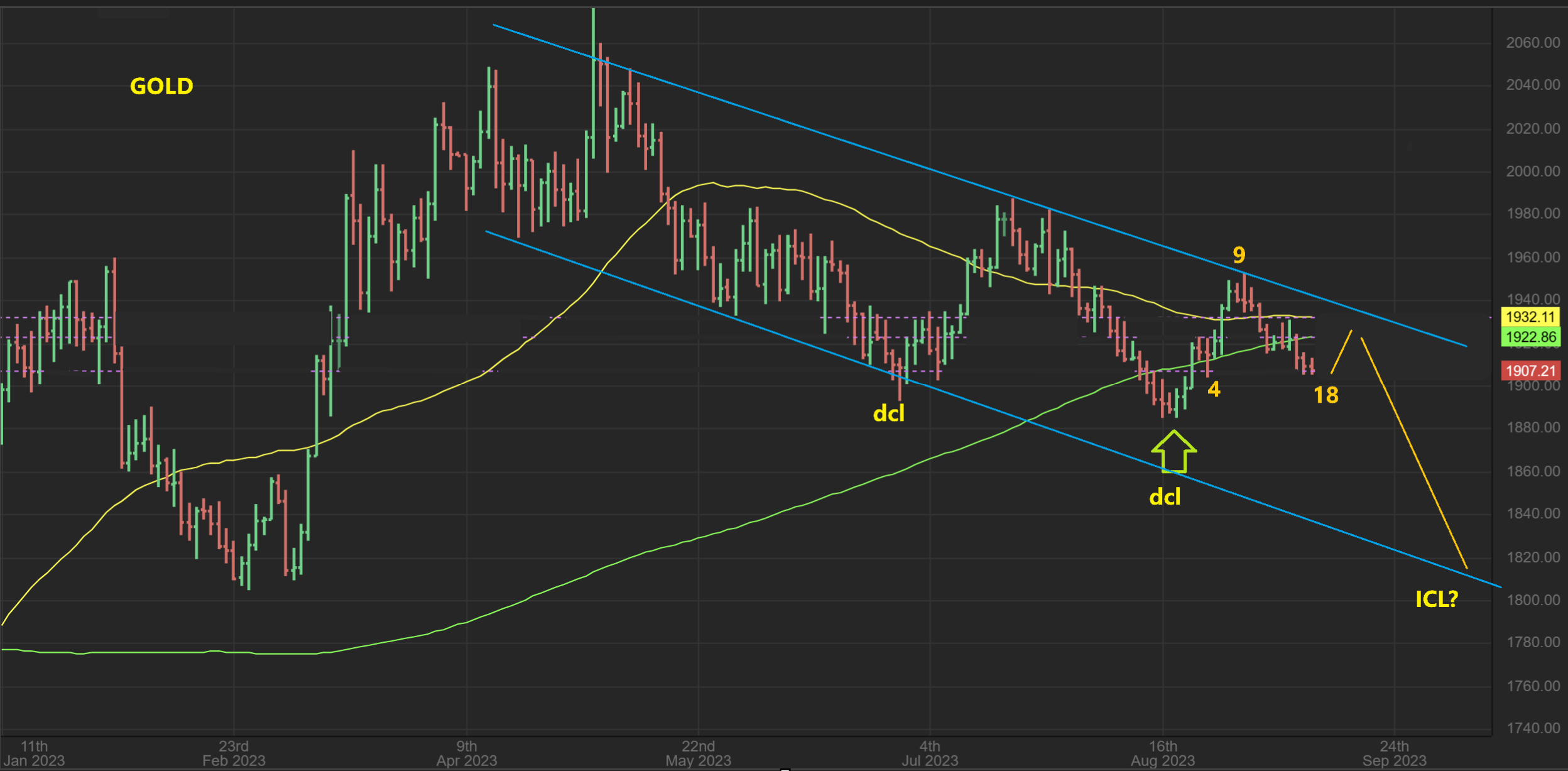 GOLD had an ICL in March and they come roughly every 6 months or so, give or take a little ‘time’. We just had that relentless day after day after day sell off in July, and that was thought to be a possible drop into an ICL in early August. That would only be 5 months after the March ICL, but I have seen 5 month intermediate cycles in the past. However, if this was going to drop into a 6 or 7 month time period, then it could look more like this price path.