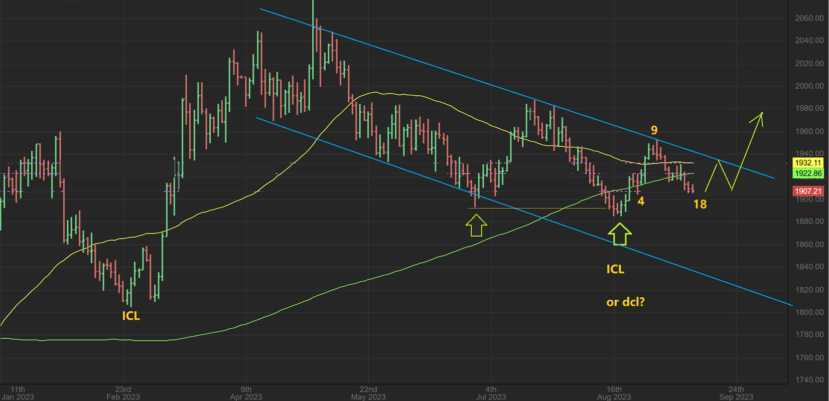 GOLD seems to be forming a large wedge and that wedge allows for another possible drop to the lower trendline. If that happens, it means that we do not have an ICL in place here with the August lows, instead we have another daily cycle that could roll over into an ICL drop. That said, We also COULD still break out higher if that USD rolls over, so let me draw both scenarios…