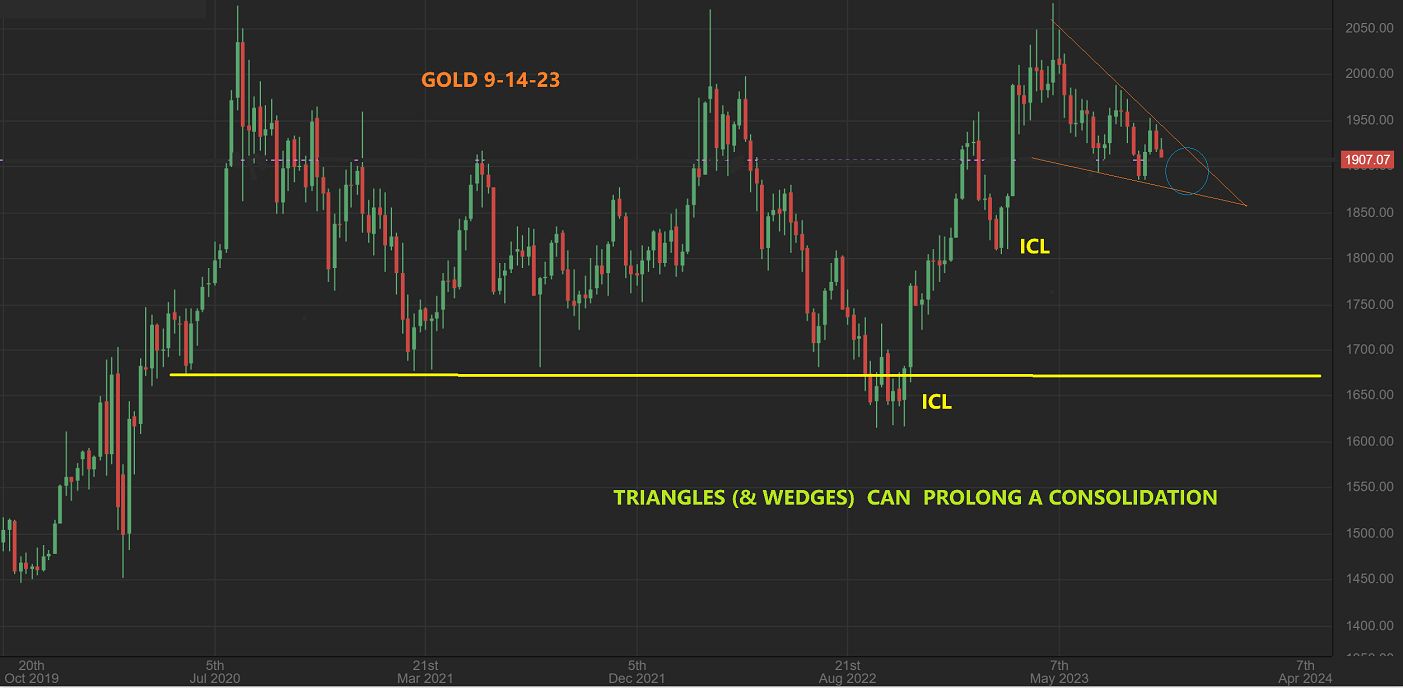 When a low forms in Gold, We buy that swing low as a dcl or in some cases a possible ICL. We are looking to buy the lows and ride it higher out of an ICL. I want to discuss Gold in detail here as it chops sideways. WHY? I do have short term concerns, since it is still having trouble breaking out higher and Miners have not been leading the way. I always look for signs or clues as things unfold and that is what I am doing now, around day 18 of this daily cycle. The concern is ‘time’. Gold ran to prior all-time highs and pulled back as though it were ready to break out after a brief pause. As time went on, I now see a larger consolidation taking place that may need more ‘time’ to complete? Consolidations often start to form a pattern of some sort over time, and I see a possible wedge or triangle. So…